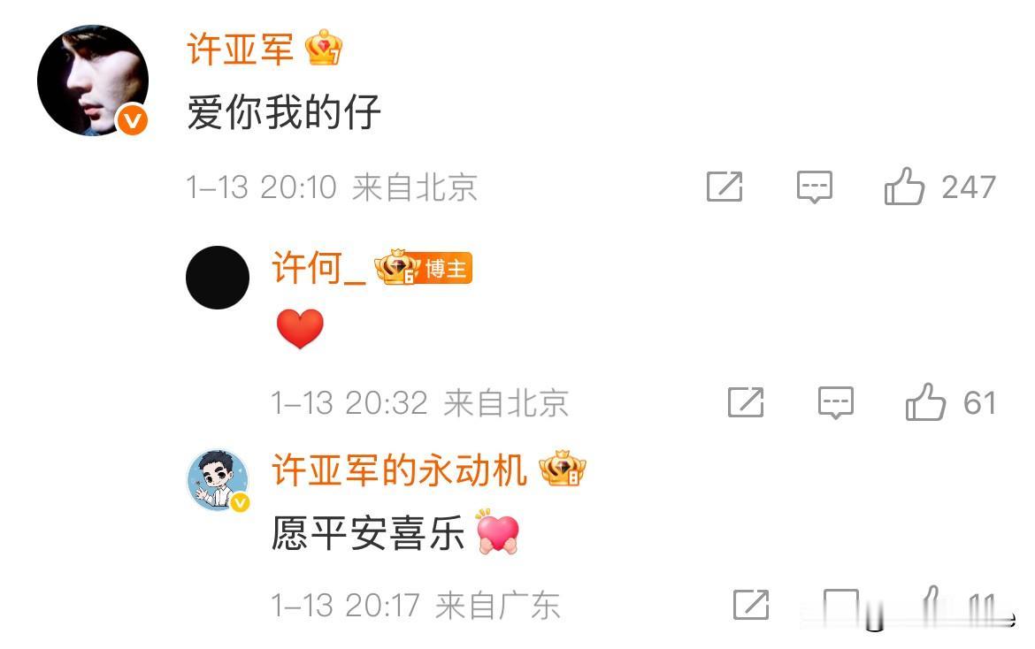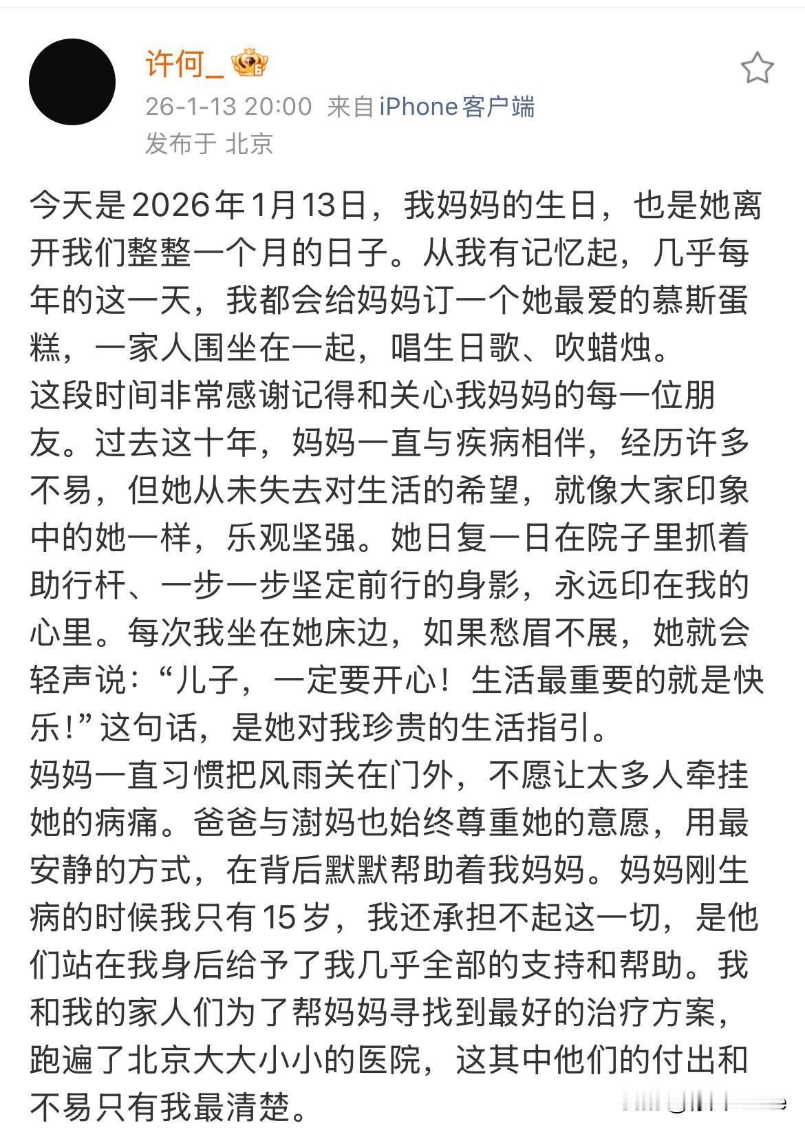 1月13日,何晴儿子许何发长文缅怀何晴 称父亲许亚军这十年在母亲何晴的事情上给予了自己全部的支持与帮助,一直在他背后默默协助母亲何晴治疗,这些付出他都看在眼里,记在心里,全文没有一句感谢,我却看到了很多个谢谢与感恩! 愿逝者安息,生者节哀,也希望关于他们家的流言蜚语尽早退散,期待在荧幕中看到许何的身影,子承母业!何晴