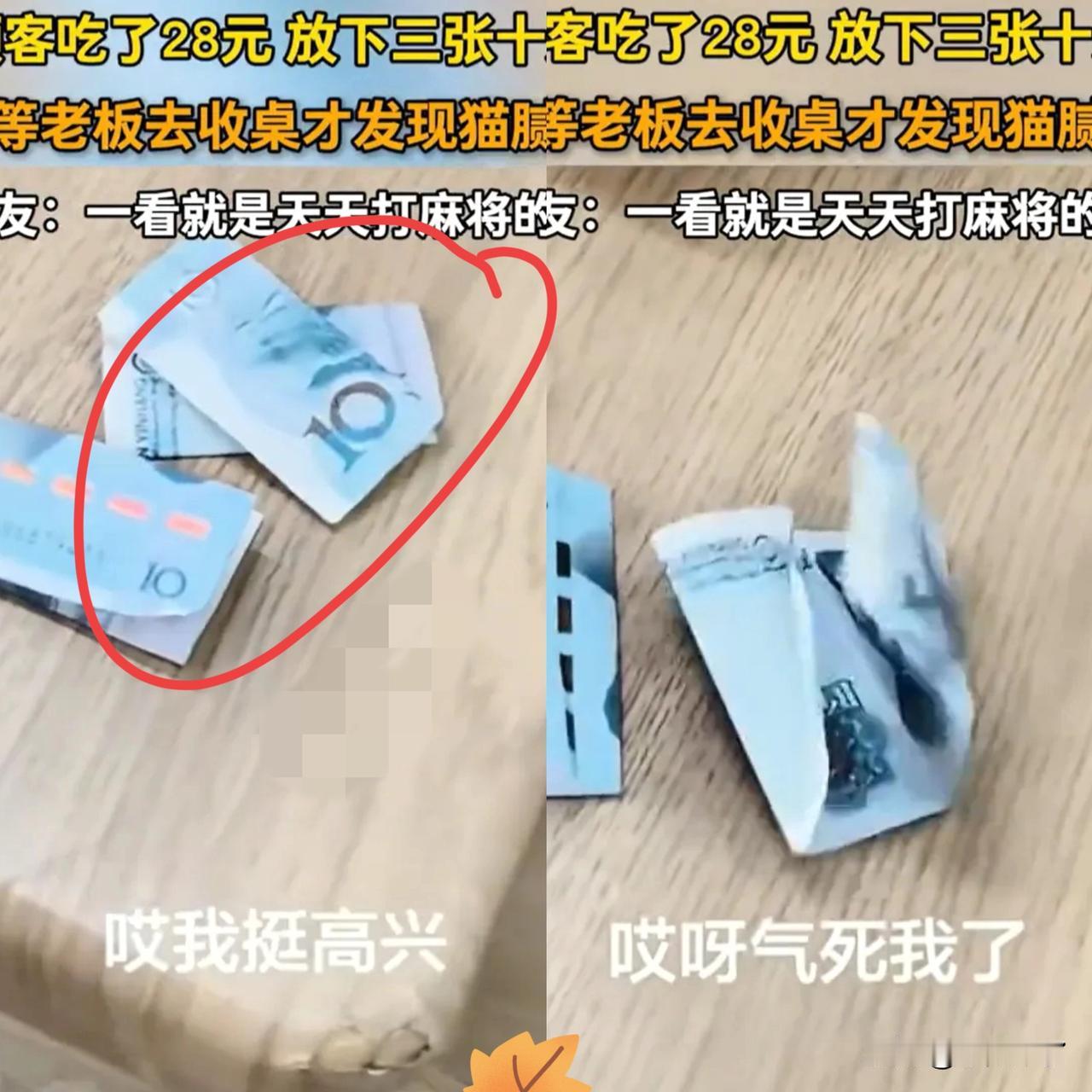 “太缺德了!”四名女子去小餐馆吃饭花了28块钱,吃完后就把钱放在餐桌上离开了,老板收桌时发现三张十块钱,可把钱拿起来一看,竟用半张10块钱叠成整张充数,耍小聪明坑了老板8块钱! 老板收拾餐桌时瞅见“三张”十元钞,还美滋滋打趣说人家没准看自己帅,特意多付了2块不用找零。 结果手一拿就察觉不对,抽出来发现猫腻——一张是从中间整齐撕开、对折叠成两层的,实际只付了20元。 网友看完直呼这手法太熟练,一看就是打麻将的老手!小本生意赚的都是血汗钱,真要是手头紧,跟老板说一声大概率能体谅,可这种刻意欺骗的把戏,伤的不只是8块钱,更是人与人之间的信任! 这哪是占便宜,分明是丢了人品又失了体面!