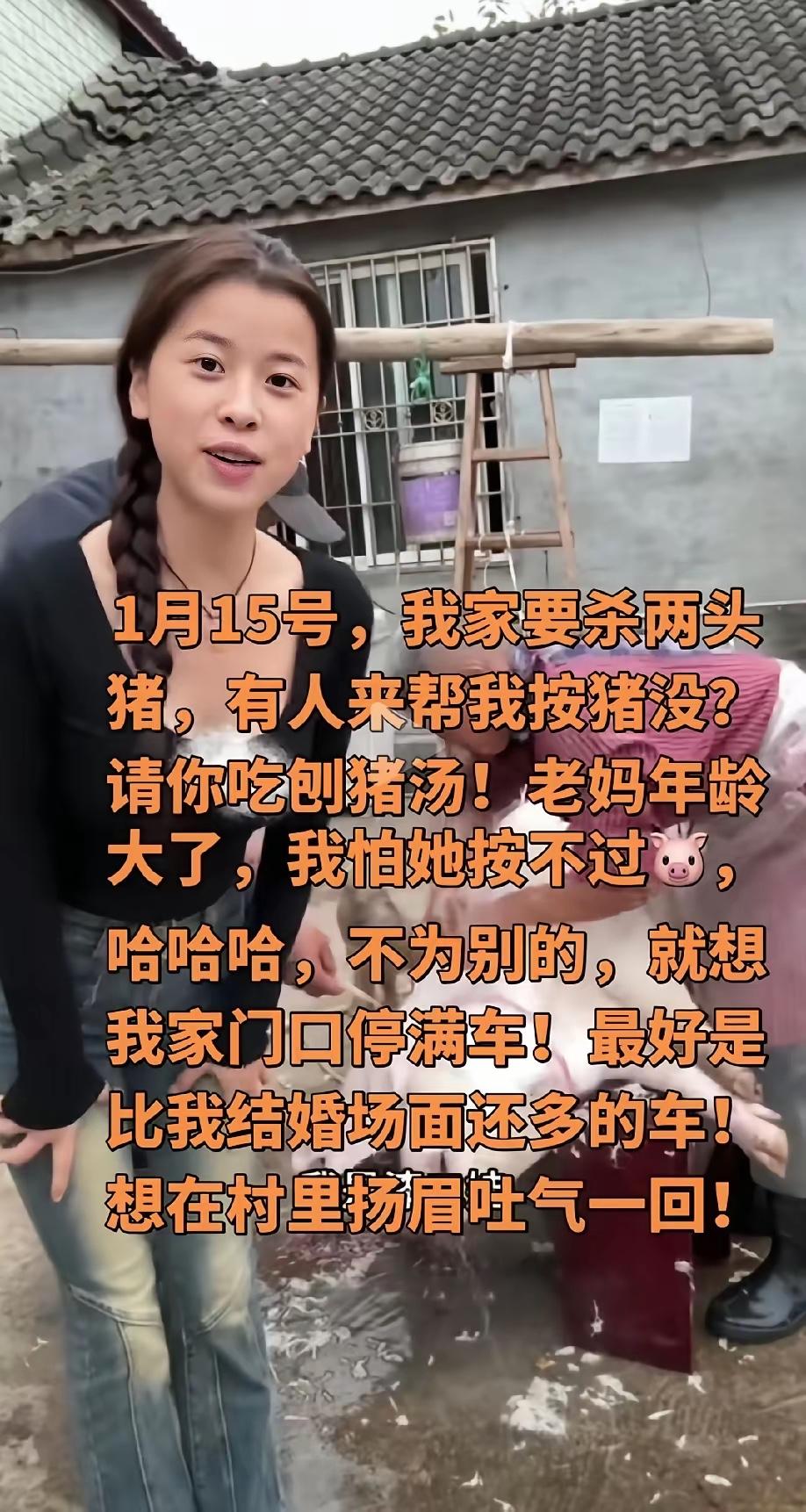 呆呆的“暴富”让不少网友眼红, 这不, 一美女效仿呆呆,也是两头猪,希望有送帮忙按猪,请吃刨猪饭。 能看得出,这位美女比呆呆看起来更活络,嘴皮子也更厉害一点。 不过,呆呆能爆火,因为她是第一个,而且没有剧本。 这位美女是合川本地做农特产品电商的,平时就靠拍短视频带货,看着呆呆从1800多粉丝涨到近200万,还带火了整个合川的刨猪汤经济,心里难免动了心思。她家里本就养着两头合川黑猪——这种有1600多年养殖史的本地品种,肉质鲜美,本是留着自家过年和送客户的,可眼见着“按年猪”成了流量密码,她当即拍板,也学呆呆发了求助视频。 视频里,她特意打扮了一番,镜头角度找得精准,说话一套一套的:“家人们,合川黑猪刨猪汤安排上!有没有想来帮忙按猪的?管够热汤热饭,还能带走咱们本地的桃片糕伴手礼~” 她甚至提前建好了粉丝群,还在群里预告了直播时间,连现场要摆多少桌、请谁来帮忙炒几个特色菜都规划得明明白白。可群里响应的人寥寥,直到约定按猪的那天,来的也大多是附近想蹭饭的村民,远不如呆呆家那车从村头排到村尾、跨省赶来的热闹场面。 不是网友变冷漠了,是大家早就看透了套路。呆呆发视频时,背景是自家简朴的院子,鸡在旁边踱步,语气里满是担心老父亲按不动猪的真切,连“想让家门口车比结婚多”都是随口的俏皮话,没有半点功利心。网友赶去,是被这份质朴打动——有人带了自家种的蔬菜,有人主动扛起主厨的活儿,甚至有人担心猪不够吃,直接捐了三头猪,那种素不相识却真心实意搭把手的感觉,才是这场狂欢的核心。 可美女的视频里,看不到这份真诚。她反复强调“伴手礼”“直播互动”,连请人按猪都像是在安排工作,少了乡土习俗里那份不计回报的互助。合川刨猪汤能传承千年,从来不是因为一顿饭有多香,而是院坝里乡亲们搭手按猪、烧火洗碗的烟火气,是席间闲话家常的人情味。呆呆的爆火,本质是反算法的粗糙真实击穿了满是滤镜的网络环境,而不是“按猪”这个行为本身有多特别。 更关键的是,呆呆的走红是一场双向奔赴的意外,美女的效仿却带着明确的功利目的。合川文旅当初连夜调猪、派工作人员维持秩序,是为了守护网友们的善意和这份纯粹的民俗氛围,而不是为了给刻意炒作的人当“背景板”。那些千里迢迢赶去呆呆家的网友,图的不是免费的饭,是找回记忆里的年味,是体验那种不分你我、热热闹闹的真实社交——这些,恰恰是剧本里演不出来的。 现在很多人跟风蹭流量,却忘了流量的底色是什么。呆呆火了之后,没有趁机带货,反而反复叮嘱网友注意安全、不要影响村民生活;而有些效仿者,眼里只盯着粉丝数和销售额,把老祖宗留下来的民俗当成了赚钱的工具。这样的“复刻”,就算场面搞得再大,也少了最打动人的内核。 流量可以复制,真诚却不能伪装。合川的刨猪汤能成为2026年初的文旅爆款,靠的是“去商业化”的纯粹,靠的是人与人之间最质朴的情感联结。如果都想着走捷径、玩套路,迟早会消耗掉网友的热情,最后连真正的民俗魅力也会被稀释。 各位读者你们怎么看?欢迎在评论区讨论。