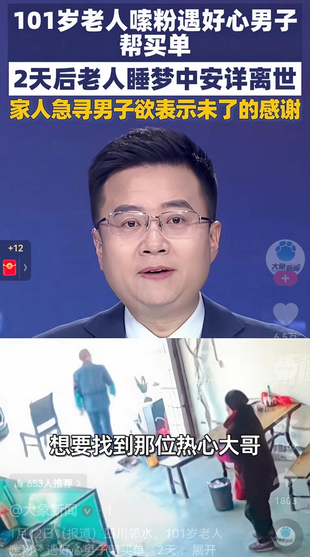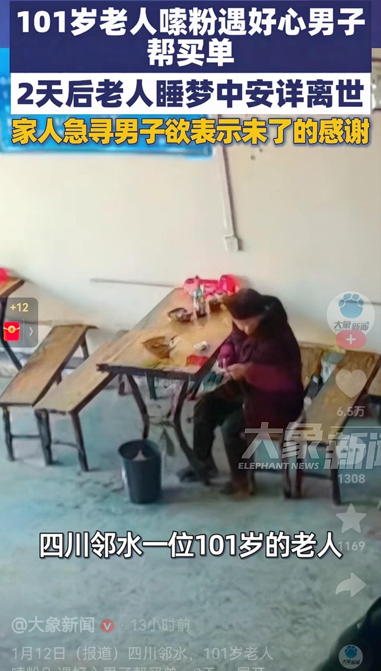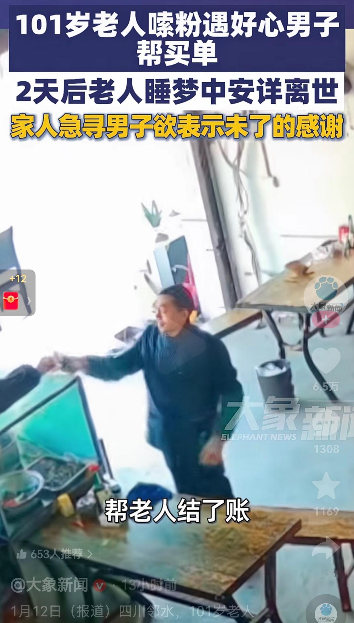 看的人心里暖暖的!近日,四川邻水,一位101岁的老人突然惦记起一碗米粉的滋味。于是,老人独自来到了一家粉店,点了一碗米粉。 等米粉上来了之后,老人正在津津有味地嗦粉时,旁边一位刚吃完粉的大哥看到了。 令人没有想到的是,他起身走到收银台,准备结账时,不仅结了自己的账,顺便还给旁边的老人结了账。 老人发现后,连忙踉跄着起身追出去想要还钱,可那位大哥只是笑着连连摆手,转身便悄悄离去。 事后,老人回到家把这件事情告诉了家人,家人得知这件事情之后,本想着一定要找到这位大哥好好感谢。 可是,命运捉弄人,谁也没有想到,这份萍水相逢的善意,竟成了老人人生里最后一段温暖的小插曲。 仅仅两天后,老人就在睡梦中安详离世,老人没有痛苦,也没有遗憾。 事情的结尾是,老人的儿女满是牵挂,想要找到那位热心的大哥表示感谢。 网友看到后评论说:“看老人踉跄着追出去还钱,大哥笑着摆手离开的样子,我眼泪一下就出来了,这才是人间该有的温暖啊!” 也有的网友说:“百岁老人馋一碗粉,是陌生大哥圆了她的小愿望,这碗粉不仅暖了胃,更暖了心,成了最圆满的告别礼。” 还有的网友说:“老人的儿女坚持要找恩人,这份知恩图报的心意太让人感动了,善意被认真回应,才能一直传递下去!” 一碗米粉,不过几块钱,却是陌生人之间最朴素的善意。一次默默买单,看似微不足道,却成了老人人生最后时光里,一抹甜甜的温暖。 而老人的离去,也让我们明白,生命中的美好真的是转瞬即逝,所以说,任何时候,都要现在就做,千万别等以后。 最后,希望这位好心大哥能被老人家人找到,替老人补上那句迟到的感谢。也希望我们都能珍惜身边的善意,也愿意成为那个传递善意的人。毕竟,一碗粉的价格虽低,却足以温暖。