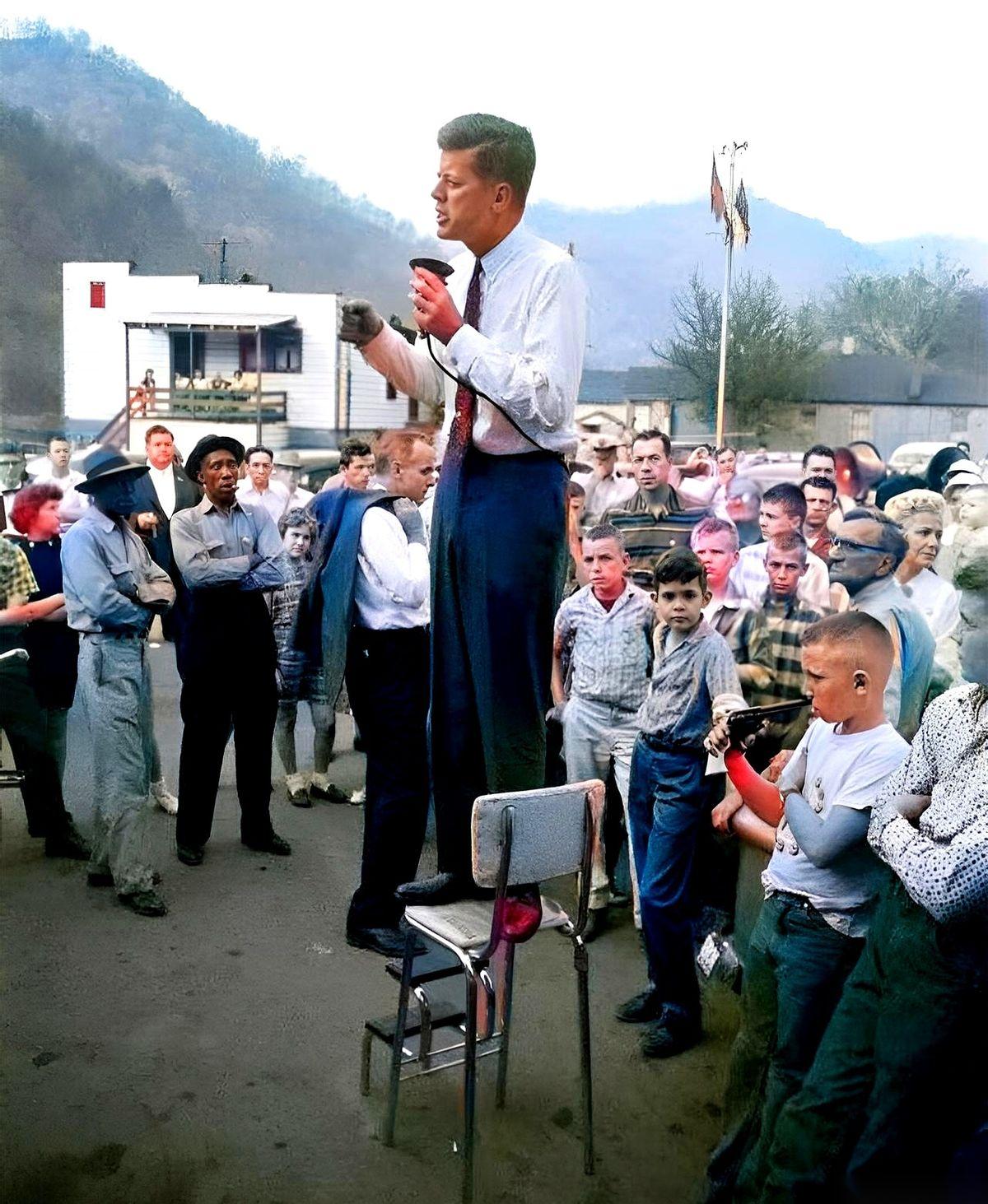 我看到一张老照片,后背瞬间就凉了。 肯尼迪,当时还在竞选,对着人群演讲。底下第一