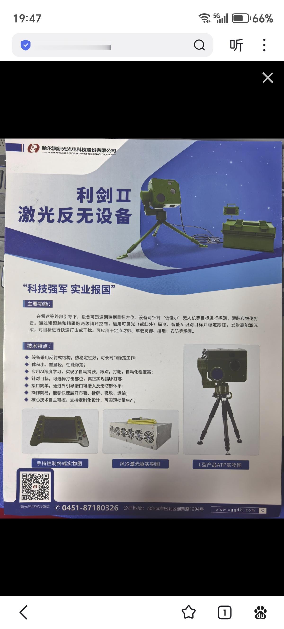 哈尔滨新光光电科技股份有限公司研制了“利剑Ⅱ”激光反无人机设备。该设备在雷达等外部系统引导下,能迅速调转指向目标方位,针对“低慢小”无人机等目标进行探测、跟踪和毁伤打击。其工作流程是通过粗跟踪和精跟踪两级闭环控制,运用可见光或红外探测、结合智能AI识别目标并稳定跟踪,最终发射高能激光束对目标实施快速打击或干扰,可应用于定点防御、车载防御、排爆及安防等场景。设备采用反射式结构,热稳定性好,可长时间稳定工作;具有体积小、重量轻、性能稳定的特点;应用AI深度学习实现了目标的自动捕获、跟踪与打击,自动化程度高;并能针对目标选择打击部位,实现精确打击。设备接口简单,可通过外引导接口接入反无人机防御体系,操作简易,能够快速展开布署、拆解、撤收和运输;其核心技术自主可控,支持定制化设计并可实现批量生产。 该系统激光光源功率为2000瓦(可扩展至4000瓦);激光毁伤作用距离在2000瓦功率下为50米至500米(干扰距离为50米至1000米);典型目标为“低慢小”目标,如大疆精灵4无人机、气球等漂浮物;转台运动范围方位为±90°,俯仰为-20°至+80°;跟瞄精度为25微弧度;通讯接口为RJ45千兆以太网和RS422;供电要求为220V,电气接口为航空插头(可按需配备);设备功耗在2000瓦功率下小于8500瓦;设备重量根据配置不同分为≤30公斤(配激光器1)和≤80公斤(配激光器2);ATP尺寸为长380毫米、宽250毫米、高380毫米;风冷激光器1尺寸为长346毫米、宽265毫米、高167毫米(可选配);激光器尺寸不大于长600毫米、宽400毫米、高200毫米(可选配)。安装接口提供两种形式:地面固定形式可通过ATP底部的安装螺纹与标准三脚架连接,或采用法兰对接;车载安装形式则根据车载振动条件配备减震装置。设备还可扩展配备定位定向模块及网络接口。