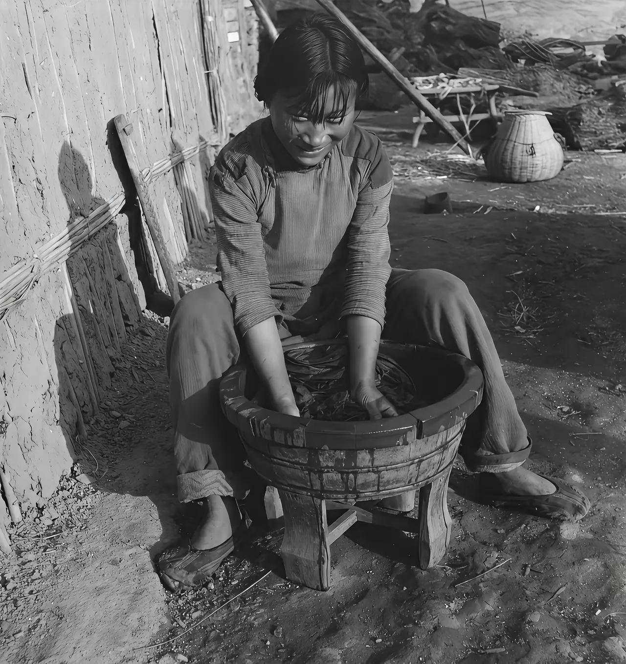 老照片回忆录:穷人家的媳妇在洗衣服,虽然穿的破烂,脸上有笑容,估计遇到了好事,保佑她一切幸福安康。