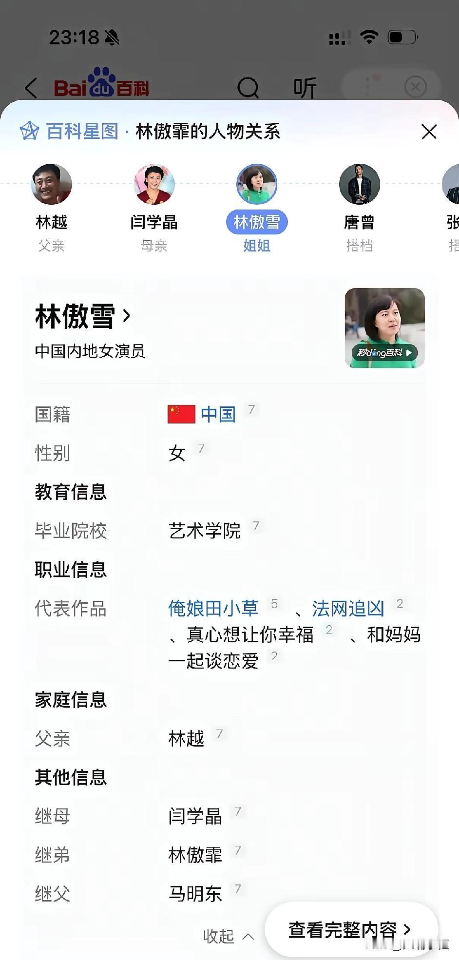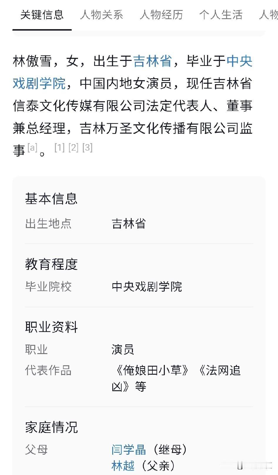闫学晶的瓜,真是越扒越有啊。 原来辽宁台真的早早把她预定为春晚演员了,只不过这次风波太大,又被除名了,不过这些都不是她现在最头疼的,她最头疼的是,儿子女儿都毕业于中戏的争议还没解决,又跑出了继女林傲雪的问题。。 目前林傲雪已经把毕业院校隐去了中戏,改为艺术学院,却印证了此地无银三百两,另外,马冬明怎么成了她的继父? 谁都知道林傲雪是闫学晶的继女,林越的亲生女儿,闫学晶和林越离婚后,她好像没有理由跟着继母啊,除非她是闫学晶的亲生女儿。 闫学晶21岁生林傲菲,如果林傲雪也是亲生的,那她20岁左右就生孩子了? 另外,如果林傲雪是她的亲生女儿,在生育政策还没有放开之前,这属于超生,又是怎么被海政录取的?