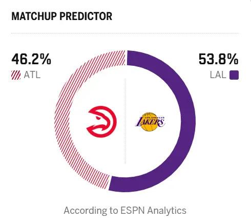 湖人前19场15胜4负高居西部第二,后18场仅取得8胜10负,暂时排在西部第五。 今天湖人将背靠背对阵老鹰,老鹰已经取得了3连胜,今天赛后湖人可能掉到西部第七。 东契奇、詹姆斯今天都不打,湖人怎么赢?ESPN给出的胜率,湖人居然超过老鹰……