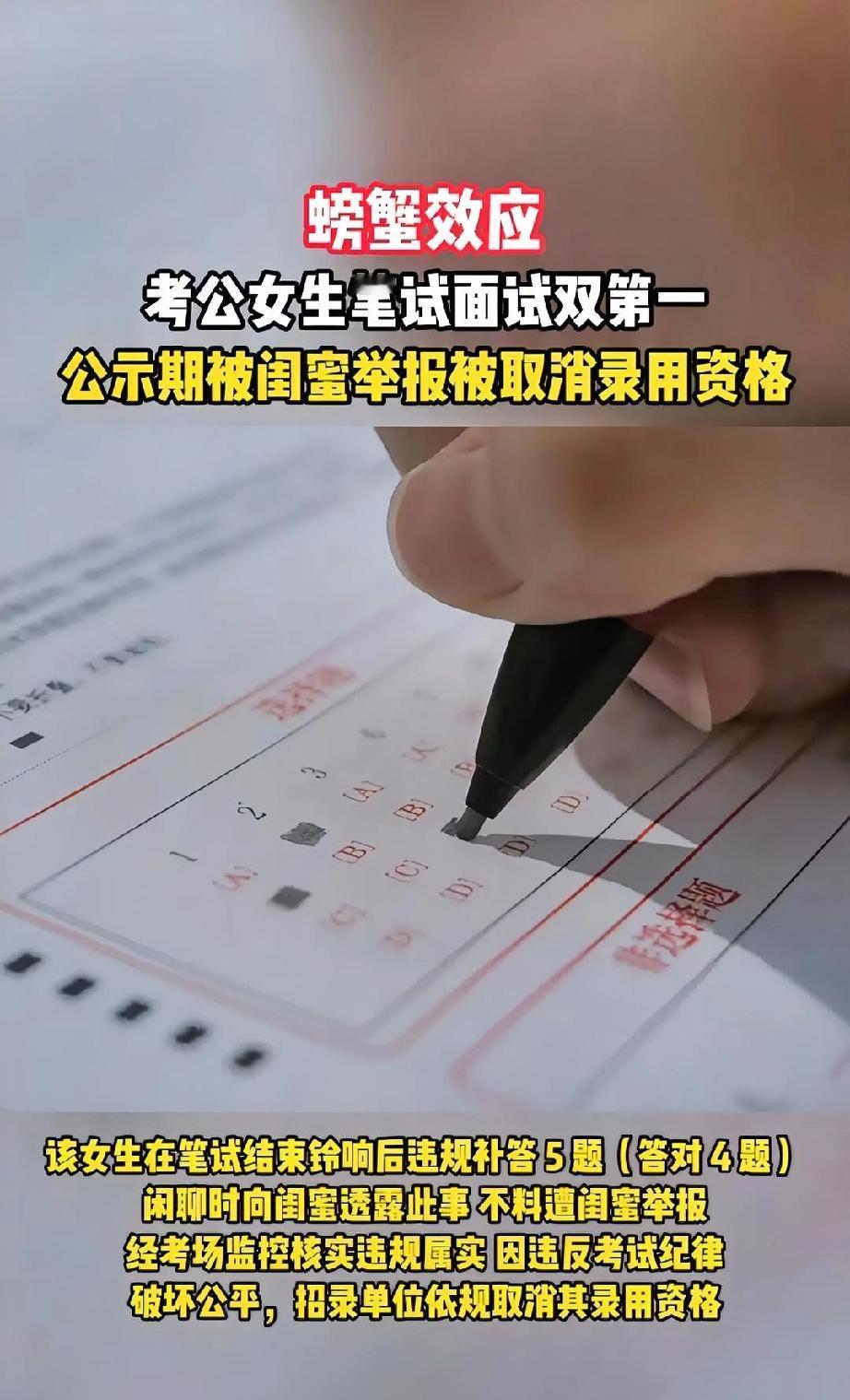 嫉妒心作祟! 看朋友考公上岸就眼红, 反手一个举报毁人前程! 一女子考公笔面体检全过,兴奋得跟闺蜜分享,顺口说铃响后多答了5道题。闺蜜心生嫉妒反手举报,官方查监控实锤违规,女子被取消录用资格! 超时答题违规被取消资格是按规定来的,但就因为闺蜜的举报,让考生的心血全白费! 真心换来了驴肝肺!跟最信任的闺蜜分享喜悦,转头就被举报,这事儿看完,还敢随便跟人掏心窝子嘛?! 女生考公