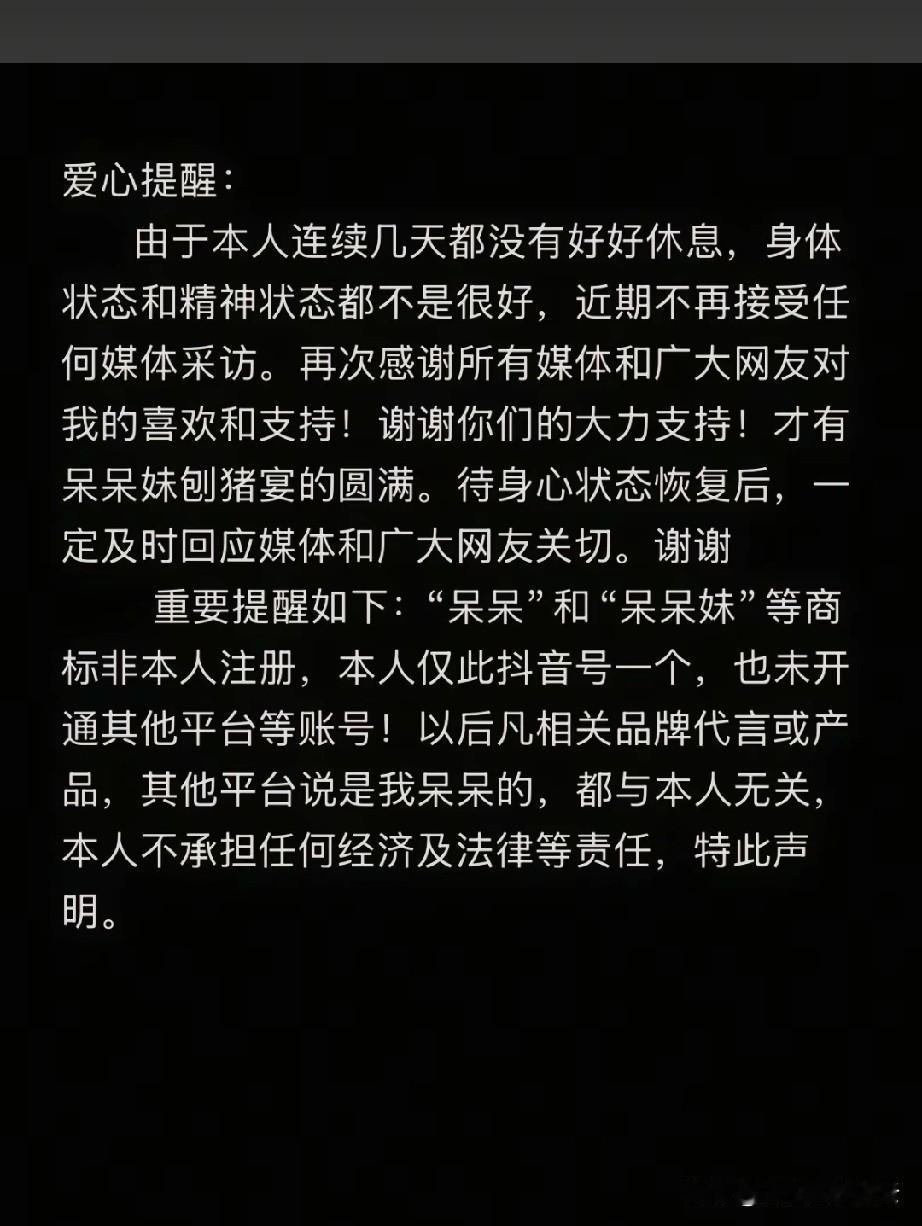 呆呆虽然看起来呆,其实是有大智慧的。现在她的粉丝多,流量大,我相信找她采访、代言、卖货的肯定不在少数。可是呆呆还能够保持初心,不仅没有趁着流量大赚一笔,反而发声明说会休息一段时间。 其实这就是这个女孩的过人之处,不被金钱迷惑,依然活的很清醒,知道自己想要的是什么。你看她现在这么火,如果她太高调的话,可能不久就会招来反噬,你看湖南的灿灿,网上说什么的都有。但是呆呆,风评就一直很好。 在流量就是金钱的今天,这个重庆妹子还能保持这份初心,真的很难得。难怪她会大火。