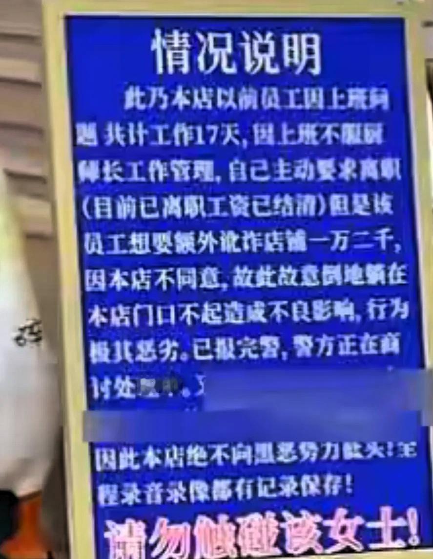 碰到狠人了! 近日,河南商丘一餐馆门前,一大姐躺地上用帽子盖头,躺4天了。 一大姐在店里干了17天,因不服从管理主动提出辞职,店家二话没说就把工资足额结清了。谁料她转头就狮子大开口,索要1万2的赔偿金,双方协商没谈拢,这位大姐直接往餐馆门口一躺,帽子盖着头,任凭店家和旁人怎么劝都不起来,这一躺就是整整4天。 大冬天的,躺在冰冷的地上,看着就让人觉得遭罪。路过的人一开始还以为是商家搞的行为艺术,了解内情后纷纷直摇头。店家也是被逼得没辙,只好立了块牌子写明来龙去脉,还特意用大字标注“请勿触碰该女士”,生怕好心帮忙反而惹上不必要的麻烦。 店家早就报了警,可面对这种情况,一时也没有特别好的解决办法,店里的生意更是被搅得一落千丈。 明眼人都能看明白,员工主动辞职,而且店家已经足额结清工资,从法律层面来说,根本没有支付赔偿金的义务,17天的工作时长张口就要1万2,更是毫无道理可言。更关键的是,在公共场所赖着不走,扰乱商家正常经营秩序,这种行为已经涉嫌寻衅滋事了。 维权本就该走正规渠道,劳动仲裁、司法调解,哪条路都能讲道理,偏要靠耍无赖博关注,不仅解决不了问题,最后还可能要承担相应的法律责任。