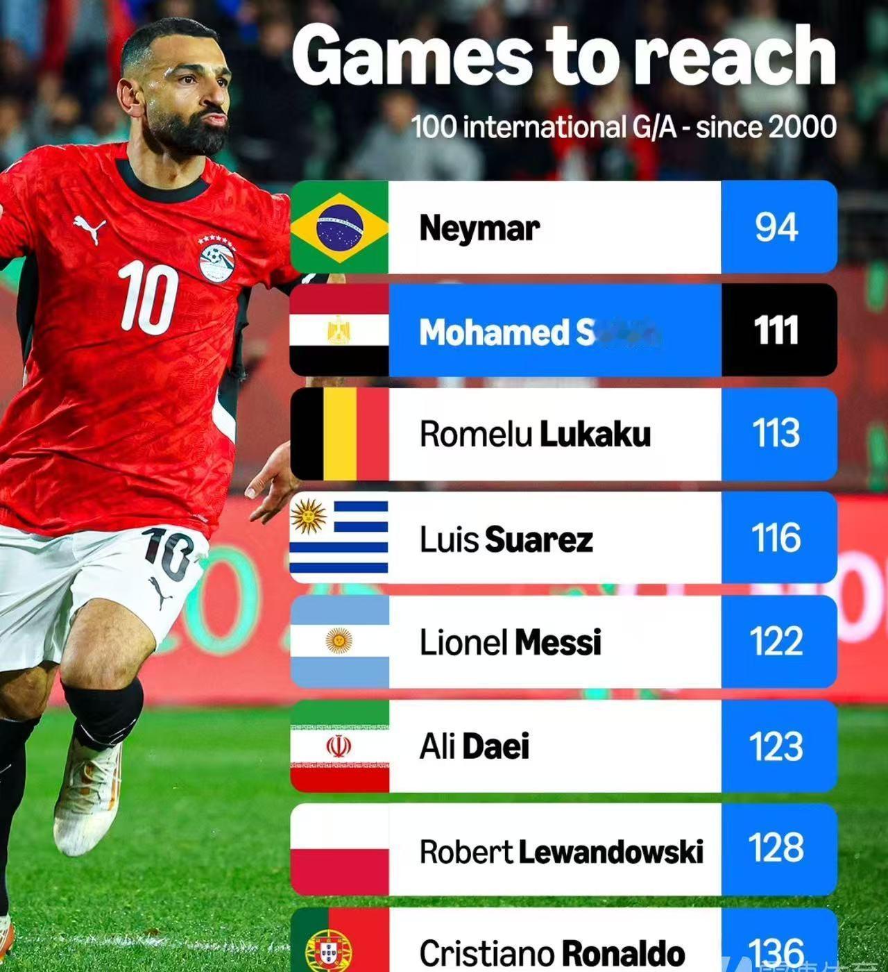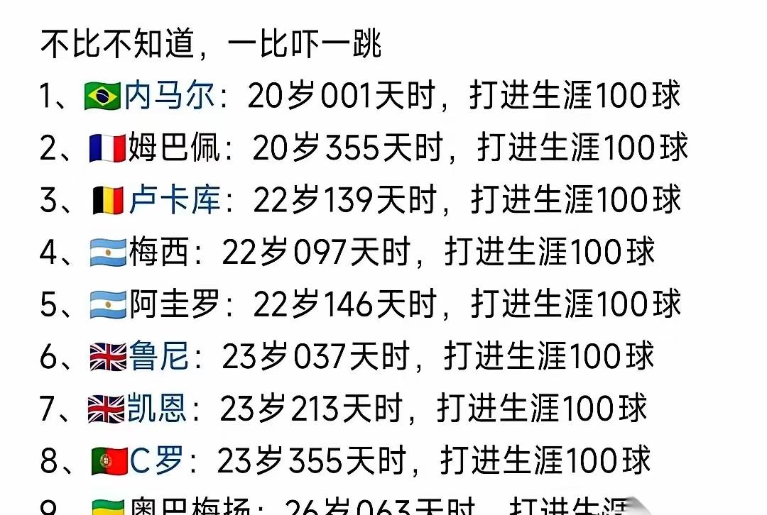 天赋异禀在足球场上最能展现! 这几个字用在现役球员那个身上最适合呢? 那肯定是内马尔身上最适配! 你知道吗,当内马尔打进100个球的时候,他才20岁。 姆巴佩21岁,梅西2岁,C罗23…… 再看打进100球时,他们都用了多少场呢。 内马尔94场,姆巴佩137场,梅西210场,C罗301场。 内马尔 梅西 C罗