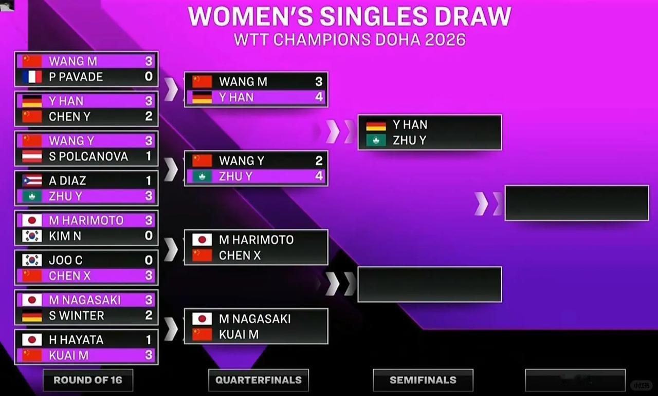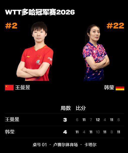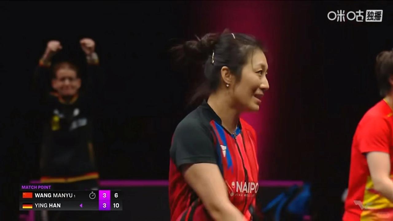 今晚这比赛结果是真没想到!42岁的韩莹4-3战胜王曼昱,只能说,永远不要低估老将想赢的心! 这场比赛,不得不说韩莹真的太顽强了,42岁,跟腱还受过2次伤,和世二打到决胜局,最后还赢了,谁看了这场比赛都佩服这名老将! 前面,韩莹3-2逆转国乒小将陈熠,大家还觉得陈熠之前都赢过韩莹,这次又没打过,有点不应该吧。 今天,韩莹和王曼昱打到决胜局,最后还赢了,这场比赛可以说韩莹发挥的非常好,有削,也有出其不意的快攻,几乎没有什么失误。 下一场,韩莹对朱雨玲,韩莹要是能赢朱雨玲,那真是发挥超常了! 这么一看,上半区王艺迪和王曼昱都出局了,半区没了,下半区就看陈幸同和蒯曼谁能打出来了。