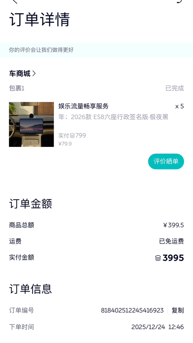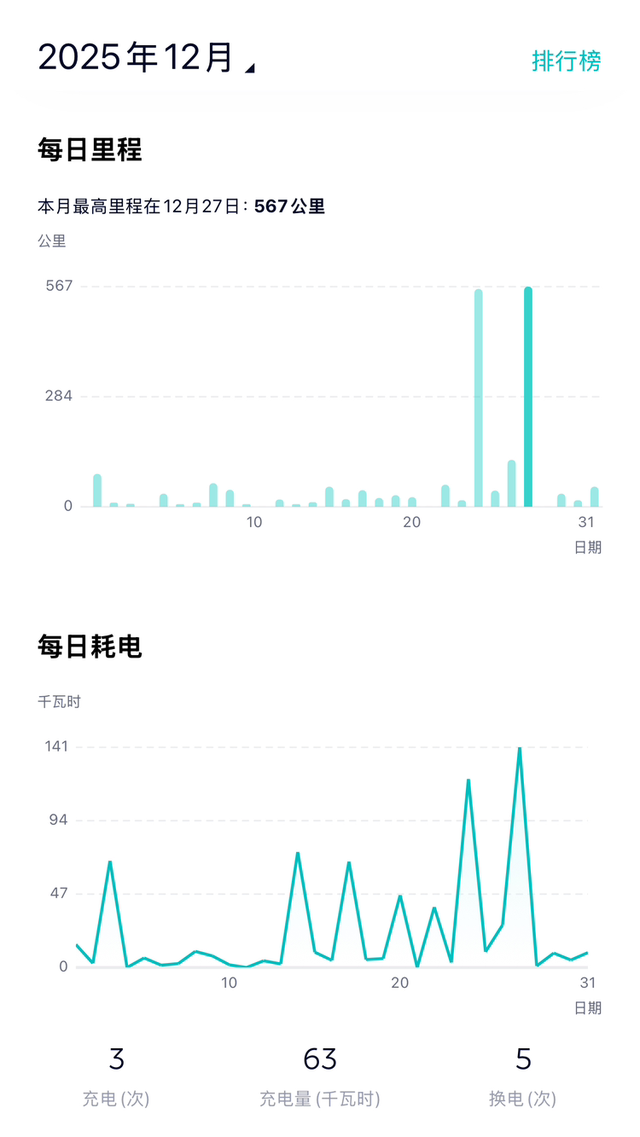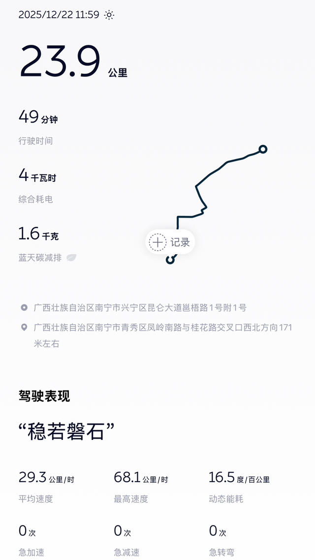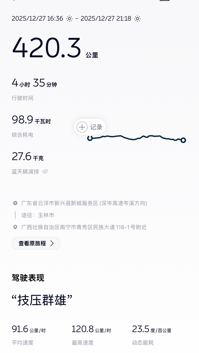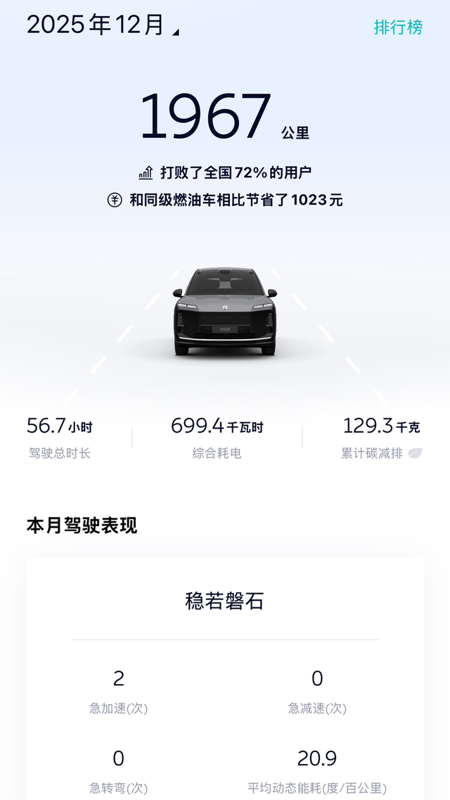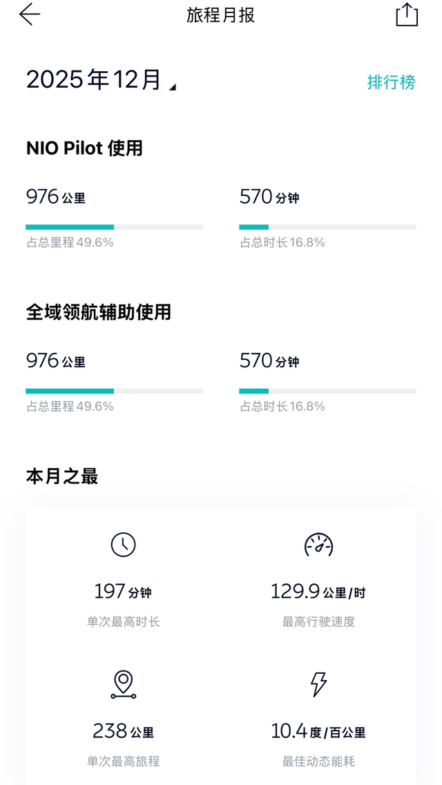 新ES8用车报告能耗比想象的低 我的蔚来ES8总行驶里程1967公里,驾驶总时长56.7小时,综合耗电699.4千瓦时,平均动态能耗20.9度/百公里。 行程概括:月底出差广州,单程约550公里,所以总里程1967里面有50%左右是高速,50%是城区用车,平均动态能耗20.9度/百公里,没想到那么低。 用车成本:充电3次共63度约70元,换电5次费用约516元,合计586元,折合0.297元/公里(高速上的电太贵了)。 全域领航辅助使用(智驾):976公里占总里程49.6%(高速跑),城区未使用。 用车体验: ①:3代车型换电对比二代车型来说没那么方便,上面有提过充了3次电(去换电站的途中)。 ②:这辆车的能耗基本上摸清了,市区约17-20度/百公里,高速约22-24度/百公里,用车城市南宁及广西周边为主。 ③:车子开起来挺灵敏的,没有笨重感。但是停车好难(在广州住的是城中村),太考验技术了。 ④:守卫模式,真是个好功能,在陌生的地方,再也不怕车子被别人误伤了,耗电极低。 体验差的地方:车机流量既然限量,由于出差,所以后排娱乐屏就一直用着,突然就看不了歌也听不了(车机导航不影响),后来只能购买“娱乐流量畅享服务”,约64元/年。