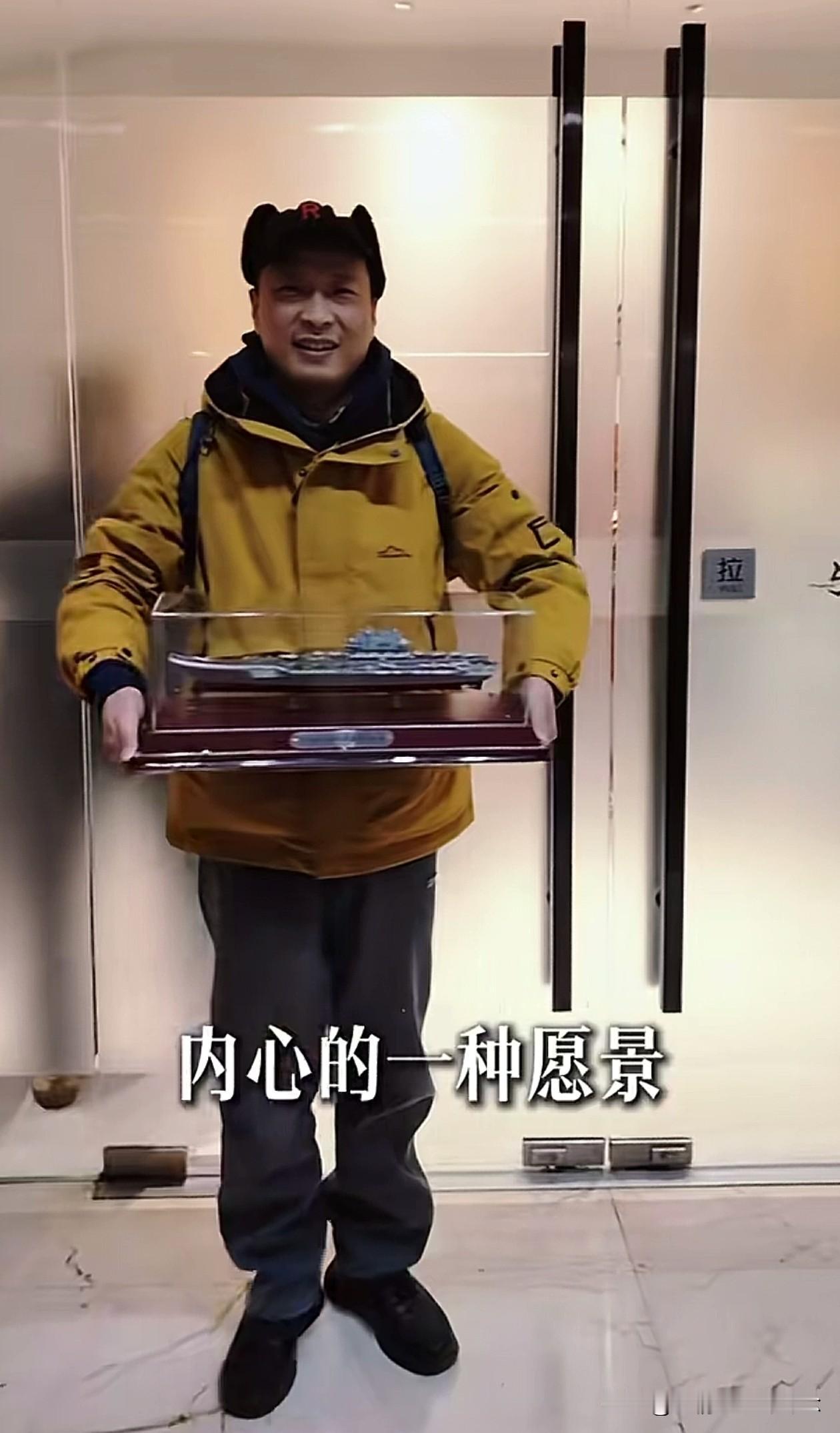 给“与辉同行”两周年送军舰的人找到了,今天刷到他的视频,被感动了,这不是一时兴起,而是谋划了两年送出去的礼物。 这位“与辉同行”的“老丈人”是山东人,曾经是个军人,从“与辉同行”成立之时,就计划每个周年庆都要自费送一件礼物。 这次两周年,他从上半年就开始构思,到2025年10月就准备好了这份礼物。2026年1月8日,他带着礼物,从山东出发去北京,晚上到达北京,他选择不打扰工作人员,没有进入“与辉同行”的办公大楼。1月9日,他和朋友一起,将礼物送到了“与辉同行”的办公区。 翻看他以前的视频,妥妥的“追光老丈人”,专门有一间屋子来存放和宇辉还有“与辉同行”有关的东西,比如各种定制品包装,酱牛肉,富安娜四件套,吐司,月饼,还有合影,纪念品…… 他不仅追光宇辉,也关注“与辉同行”的每个主播,还有幕后的工作人员。看着他的追光日记,被一点点感动。我想,一定还有很多像他一样的211同学,他们不追求存在感,不求回报,只是因为在某个瞬间,被宇辉的才华、被团队的真诚打动,便选择了长久的守护。 这是一种纯粹的情感——你只管发光,我便一路追随,不问归途,不求回响,只愿你越来越好。 与辉同行 董宇辉