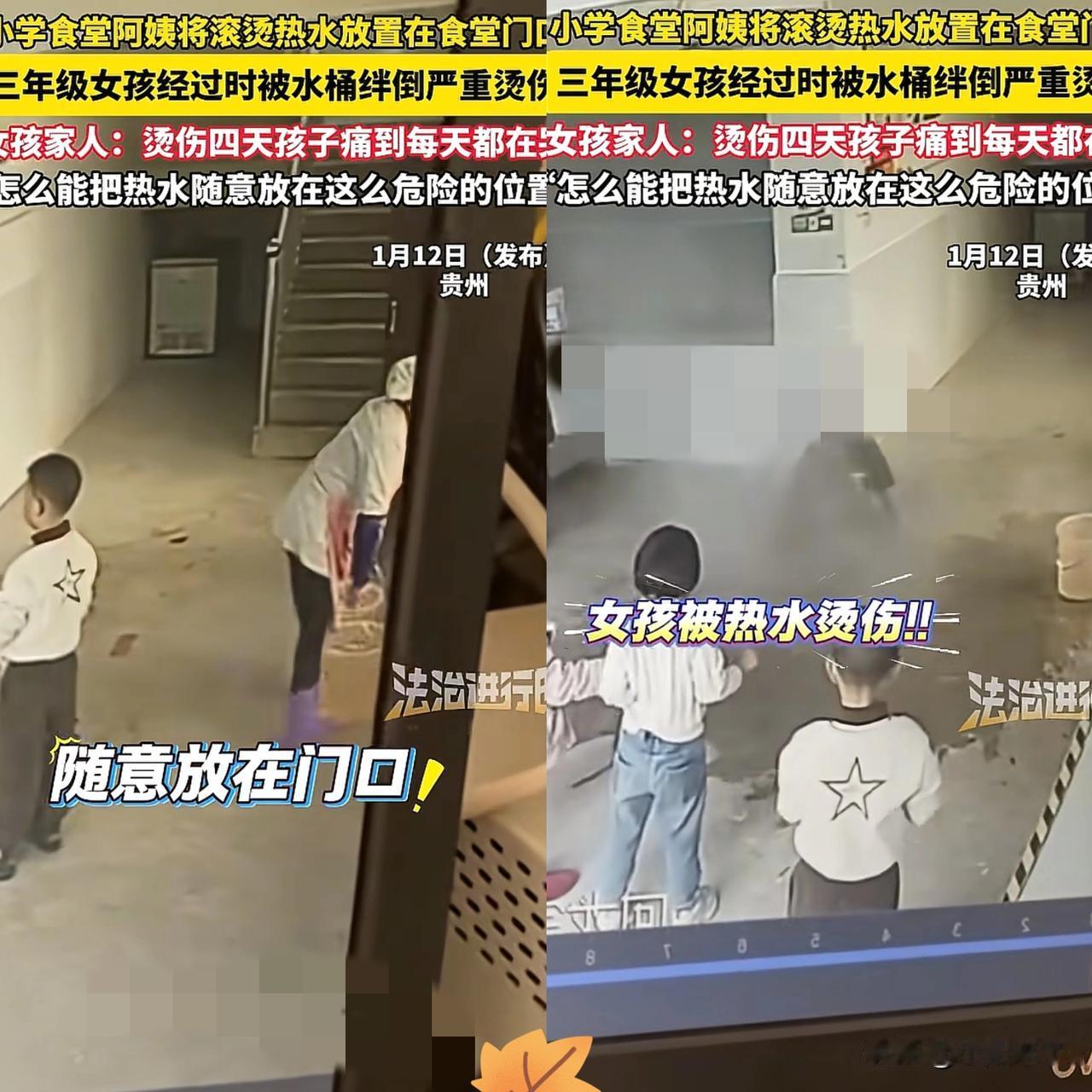 “严查到底!”贵州一小学食堂阿姨图省事,将两桶滚烫的开水放在食堂门口后,转身就去挪东西。谁知三年级小女孩推门时一脚绊倒桶,整桶热水瞬间泼在身上,凄厉的哭喊听得人揪心不已! 阿姨明知食堂是孩子扎堆进出的地方,却抱着“就放一会儿没事”的侥幸;学校本该筑牢安全防线,却让后厨成了无人看管的危险盲区。 一句苍白的“我不是故意的”,根本抵不过孩子身上的灼痛和心里的阴影。校园安全从来不是贴在墙上的一纸空文,而是每个细节里的谨慎与坚守! 这哪是什么意外,分明是侥幸心理和管理疏漏联手酿成的可预见悲剧! 大家怎么看?