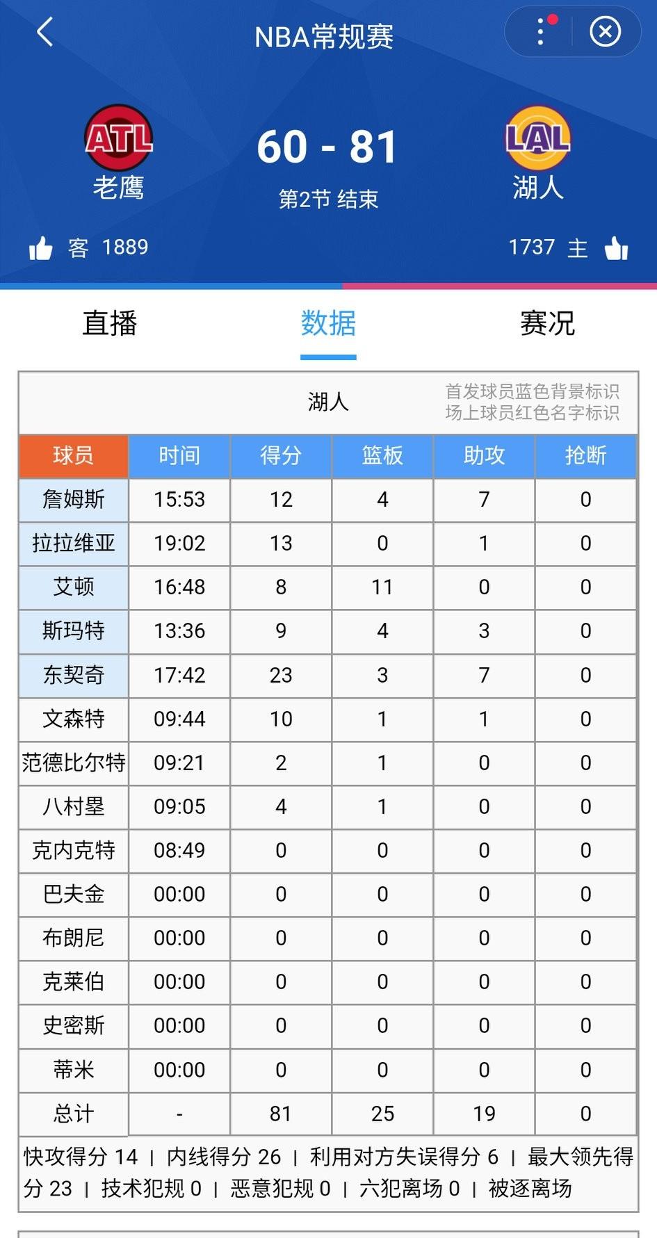 今天湖人彻底打开了,火箭都赢了,湖人凭什么不能赢!半场结束,老鹰60-81湖人。大家都不设防了…… 东子今天不仅进攻在线,防守端也能送出封盖,詹姆斯送出两个封盖,防守卖力。 八村回来了,自12月28日以来,第一次出战。文森特最近两场三分有回暖的趋势,合同年也该打出点功效了。 上半场湖人三分20中12,命中率高达60%,这还是那支熟悉的湖人吗?湖人罕见全队三分打疯了,上一次半场砍下81分要追溯到2014年。