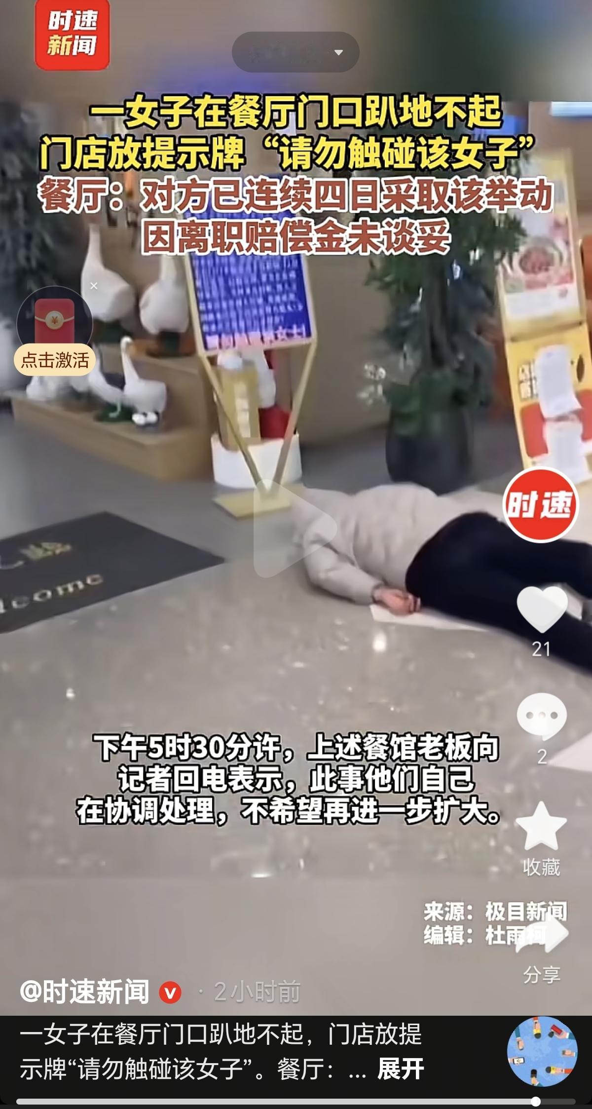 河南商丘这个餐厅火了 有一名女子连续四天在这个店门口躺着 网友们都说这是“行为艺术” 有热心的网友就去扒了一下这个事情 原来这名女子以前是餐厅的员工 因为离职赔偿金没有谈好 无奈之下采取了这种极端的方式维权 打工人真是太难了 如果能通过合法的手段要到合理的赔偿 我估计正常人都不会做这样的事 老实说餐厅的老板太不会做生意了 现在这样的网络时代 餐厅门口天天躺着一个大活人 谁还敢进店消费啊 大家说是不是?