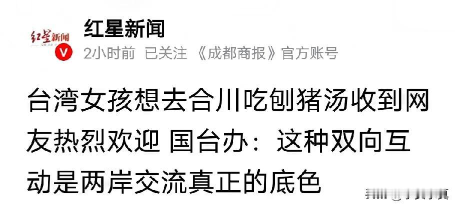 宝岛台湾来人了,呆呆这次捅娄子了, 这次呆呆捅娄子了,全国网友刚走完了,还没有歇一会儿,台湾女孩空中喊话也要去合川吃刨猪汤,国台办回应了,欢迎同胞回家深情交流,美味佳肴随便品尝热烈欢迎。呆呆这几天犯愁了刚把猪都吃完了,台湾女孩来给吃什么?