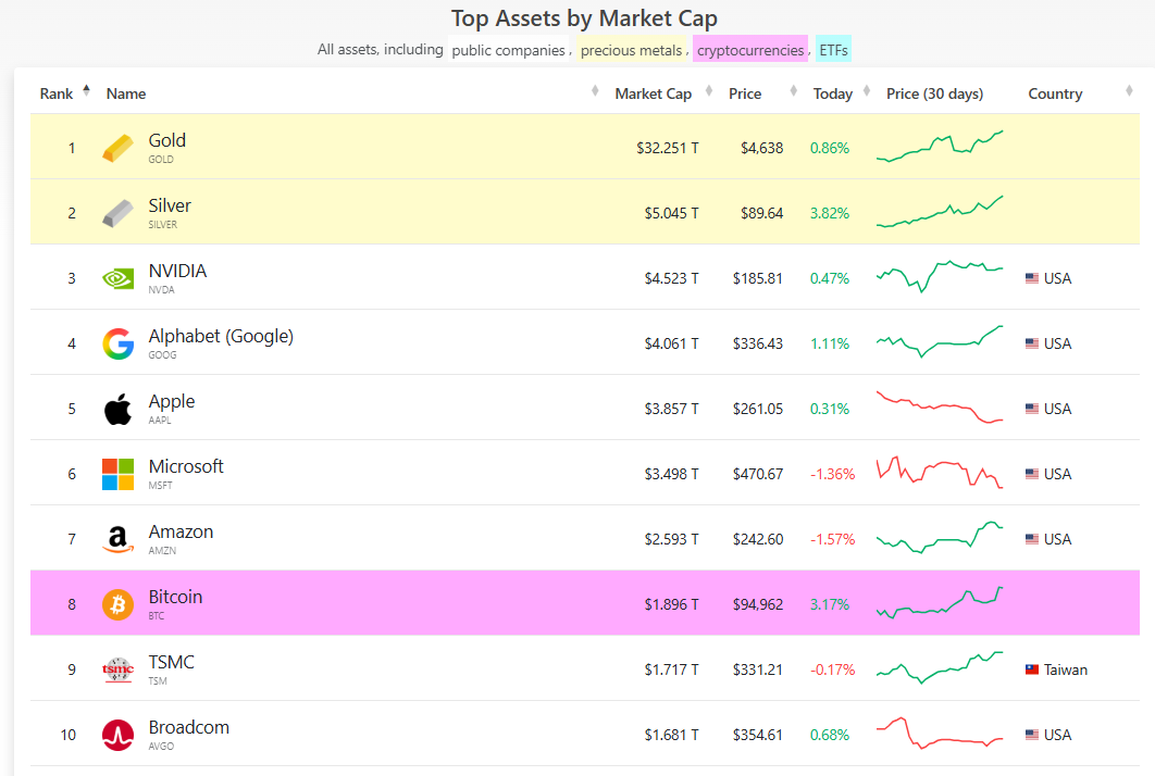 根据市值数据平台CompaniesMarketCap的数据,目前白银市值为5.045万亿美元;黄金以32.251万亿美元的市值位居榜首,芯片巨头英伟达以4.523万亿美元的市值滑落至第三。前十名榜单如下: