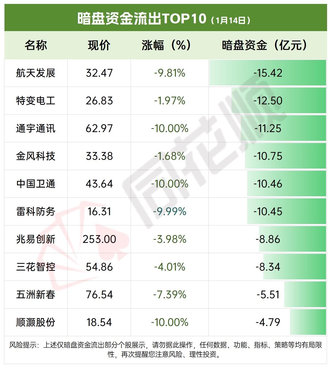 今日1月14日暗盘资金流出TOP10,注意风险! "暗盘资金抢筹榜:岩山科技涨停领跑,易点天下、蓝色光标紧随,航天电子等个股跟涨。理性投资,注意风险。" 暗盘资金流入热门股:岩山科技涨停,易点天下大涨,蓝色光标跟涨。航天电子、天龙集团等表现活跃,科大国创领跑。投资需谨慎,理性决策。
