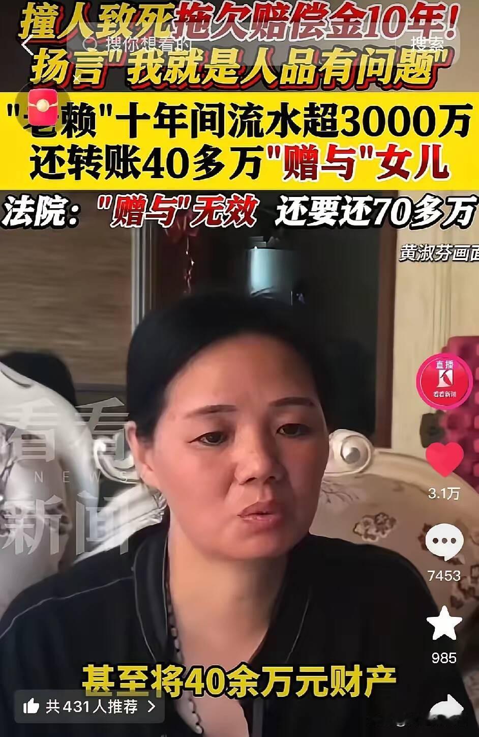 脸都不要了!唐山教科级老赖黄淑芬终于被制裁了,开车撞人致死赔偿金10年不给,终于在2025年底,法院判定她赠与女儿的40万无效,每个月退休金到账就会被扣走,但是到如今还是欠他们69万。 没人知道这10年受害者家属赵勇有多难熬。2015年父亲被撞重伤,他卖房卖物凑医药费,体重从150斤跌到100出头,欠下90多万外债,父亲还是在2017年抢救无效离世。 黄淑芬的嚣张曾跌破大众底线。事故后她只垫付2.6万元,2017年法院判她赔93.5万余元,扣除已付还需补85万,她却放话“我就是人品有问题”“坐牢也不还钱”。 更让人愤慨的是她早有预谋。一边哭穷拒付赔偿,一边在2016到2017年间,偷偷给女儿转账44万余元,还合伙贷款买房购车,甚至有境外购买奢侈品的记录。 最冷的那几年,赵勇揣着皱巴巴的法院文书,挤最早的公交跑执行局。馒头就着白开水当午饭,鞋子磨破了底,只为能多问一句“今天有进展吗”。 这场追讨就是一场持久战。赵勇手里攒下30余份法院文书,黄淑芬却用离婚析产、工资现金化等手段避执,2021年只主动赔付500元,纯属杯水车薪。 法律终究没有饶过她。2025年底唐山中院终审,依据《民法典》撤销权条款,判定40万余元赠与无效,女儿需返还偿债,精准打击恶意转移财产的行径。 如今黄淑芬的退休金成了执行突破口。她曾办新社保卡取现避执,被法院查处冻结,每月仅留生活费,其余全部抵扣欠款,总算让老赖付出了实质代价。 但69万欠款仍沉甸甸压在赵家心头。赵勇从青涩小伙熬到中年,建筑师的梦想彻底泡汤,母亲也因精神重压垮掉,一个家庭的十年全耗在追讨公道上。 黄淑芬从来不是个例,现实里总有老赖妄图钻法律空子。但这场判决明确传递信号:欠债必还、失信必惩,任何耍滑头的伎俩,在法律面前都是自欺欺人。 司法公正从不会缺席,只是有时会迟到。这十年拉锯战,既是赵家的维权之路,也是法律捍卫公平正义的生动实践,让每个受害者都能看到希望的光。 各位读者你们怎么看?欢迎在评论区讨论。