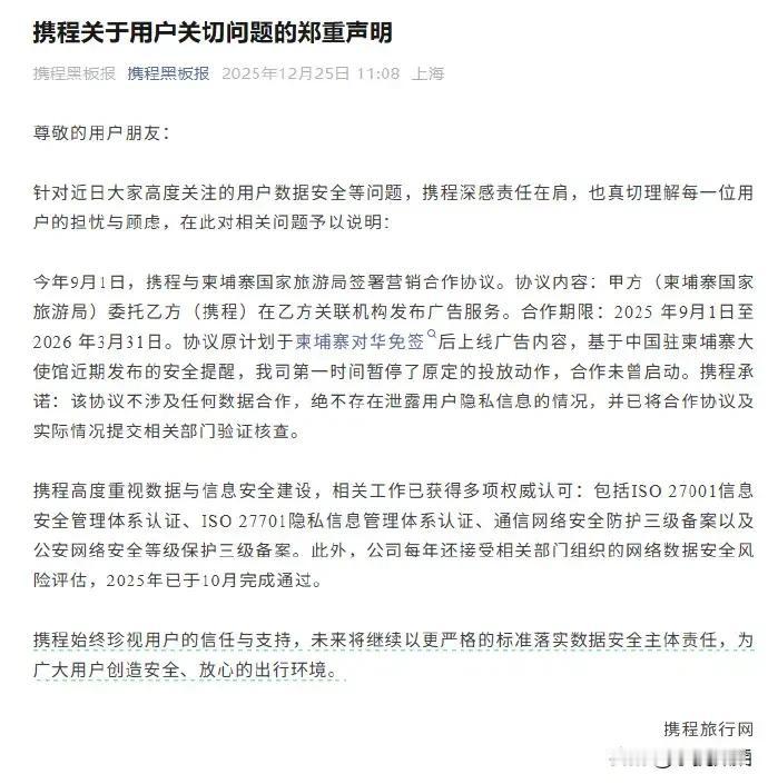 携程说,它们高度重视数据与信息安全建设,相关工作已获得多项权威认可,包括信息安全管理体系认证,隐私信息管理体系认证,网络安全。 携程承诺,始终重视用户的信任与支持,为广大用户创造安全、放心的出行环境。