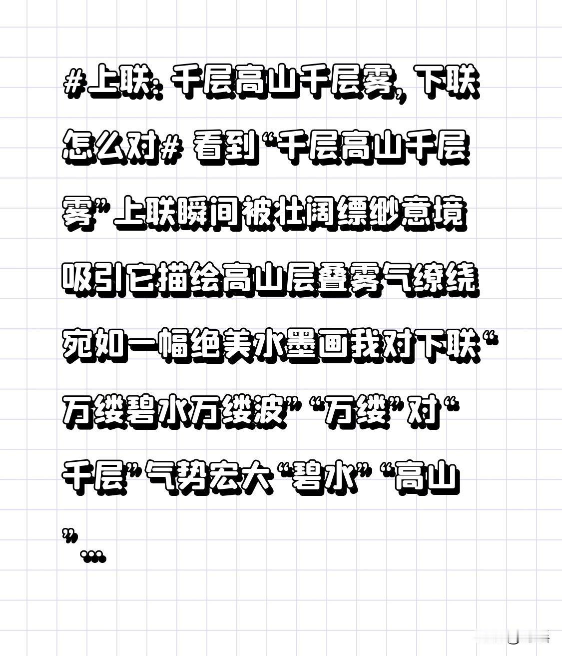 看到“千层高山千层雾”上联 瞬间被壮阔缥缈意境吸引 它描绘高山层叠雾气缭绕 宛如一幅绝美水墨画 我对下联“万缕碧水万缕波” “万缕”对“千层”气势宏大 “碧水”“高山”刚柔动静相宜 “万缕波”“千层雾”画面十足 此下联与上联如对仗诗词 尽显自然美景 你们看我对得如何?