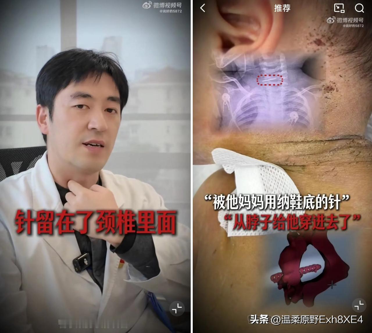 太可怜了!一名10个月大的男婴,被他妈妈用纳鞋底的锥子刺入颈部,导致针柄断裂残留在颈椎内。关键是,男婴体表面积也不大,经检查,他身体上竟然还存在约五六百个针孔! 这是一位颈椎医生今日分享的,会诊真实伤害案例。经医生了解,他妈妈原来是有一点点精神病,她自己在家看这个小孩,小孩一旦出现不听话,或感冒发烧这种情况,她就拿这个针来扎小孩,说是要给他做一个放血。 幸运的是医疗团队成功取出了带有铁锈的锥子,孩子体温也降了下来,病情已稳定。院方报警后,警方也已介入后续调查。 网络上更是引起众多热议,有网友说,精神有问题不生孩子也是一种善良,生出来又不能保证不遗传!生在精神有问题的家庭,孩子更可怜[可怜] 还有网友说,这是什么人家?让一个有精神病的人,单独长期照看孩子? 又有网友说,我们村里有一个哑巴还是一个傻子,但她却特爱特爱她的两个孩子,别人给什么好吃的,她都拿回来给俩娃吃!所以不要拿精神病当借口,有些玩意就不适合带孩子,他们会把自己的怨气都下死手打在孩子身上。 希望后续孩子安全能有保障,远离这个“精神病”妈妈!