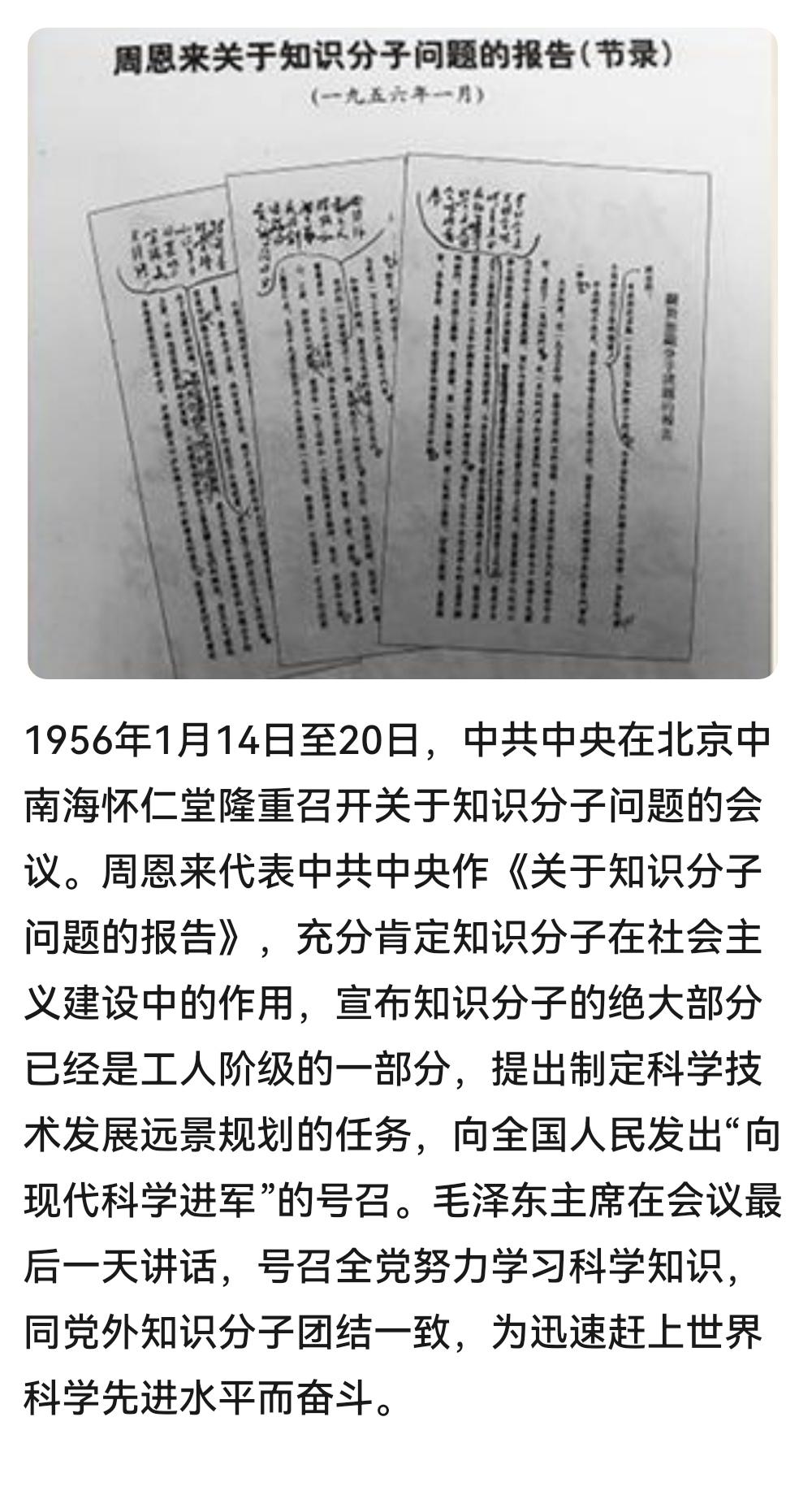 #建国丰功伟绩 历史上的今天:1956年1月14日至20日,中共中央在北京中南海怀仁堂隆重召开关于知识分子问题的会议。周恩来代表中共中央作《关于知识分子问题的报告》,充分肯定知识分子在社会主义建设中的作用,宣布知识分子的绝大部分已经是工人阶级的一部分,提出制定科学技术发展远景规划的任务,向全国人民发出“向现代科学进军”的号召。毛泽东主席在会议最后一天讲话,号召全党努力学习科学知识,同党外知识分子团结一致,为迅速赶上世界科学先进水平而奋斗。