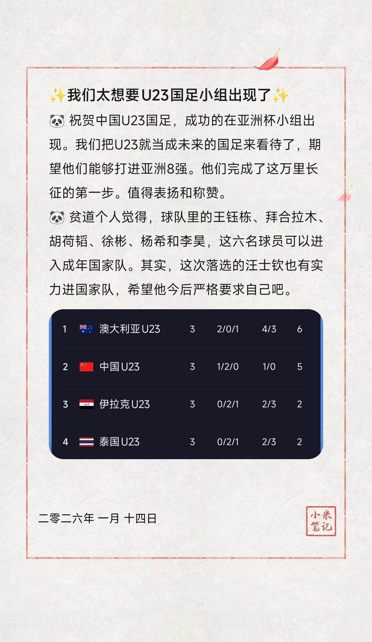 🐼 祝贺中国U23国足,成功的在亚洲杯小组出现。我们把U23就当成未来的国足来看待了,期望他们能够打进亚洲8强。他们完成了这万里长征的第一步。值得表扬和称赞。 🐼 贫道个人觉得,球队里的王钰栋、拜合拉木、胡荷韬、徐彬、杨希和李昊,这6名球员可以进入成年国家队。其实,这次落选的汪士钦也有实力进国家队,希望他今后严格要求自己吧。 🐼 U23国足今年还有一个认为,就是打亚运会的比赛,目标同样还是八强。按照规则,允许增加3名超龄球员。贫道个人认为,不出意外应该是韦世豪、塞尔吉尼奥和蒋光太(或者王上源)。 ——贫道个人认为,中国要想打进2030年世界杯,还是需要再归化5、6名球员。如果我们有5、6名在欧洲联赛踢球的队员,那就不需要归化。 作者:龙须面🧐