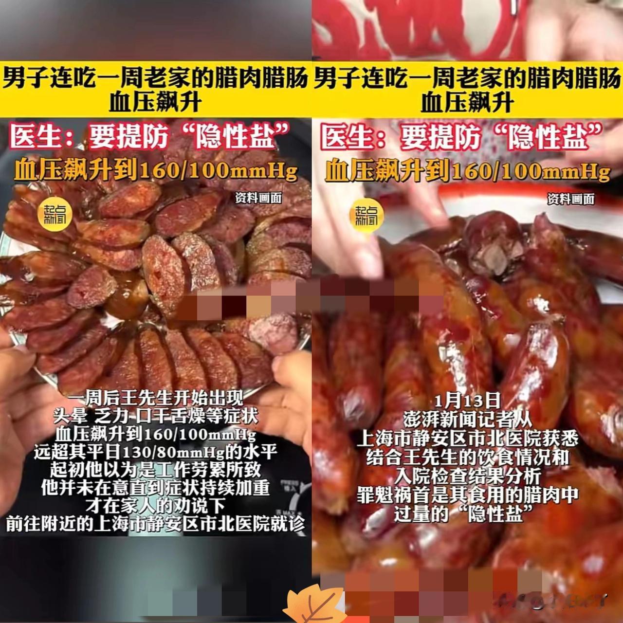 近日,上海,一男子收到老家的腊肉后,每顿饭都要吃上几口,结果才一周就头晕乏力、口干舌燥,一测血压直接飙到160/100mmHg,罪魁祸首竟是腊肉里的“隐形盐”! 年底腊肉腊肠成了餐桌标配,可谁能想到这满口鲜香背后藏着健康陷阱。腊肉为了保鲜防腐,制作时会加大量食盐,这些盐藏在肉的纹理里,吃着不觉得齁,实则钠含量爆表。 我们总盯着炒菜时少放盐,却忽略了这些加工肉里的“隐藏杀手”,不知不觉就给血管和肾脏添了负担! 这哪是解馋吃年货,分明是用传统年味给健康“埋雷”!年味再浓也别贪嘴,吃前多浸泡焯水,才能既尝鲜又护身体!