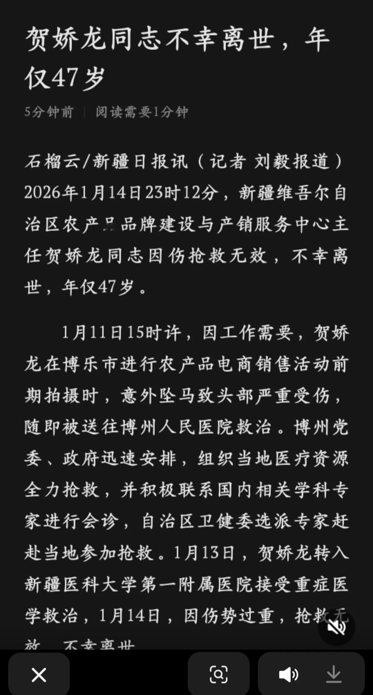 最飒文旅局长离世了,痛别贺娇龙!47岁的她,把生命留在了热爱的新疆土地上 2026年1月14日23时12分,那个身披红斗篷在雪原策马的“最飒文旅局长”贺娇龙,因工作中坠马重伤,经全力抢救无效离世,年仅47岁。 2020年,她的一段雪地策马视频让昭苏文旅爆火,从此成了新疆文旅和助农的“代言人”。为了推广家乡,她数次坠马仍不退缩,哪怕肋骨骨折、胸腔积液,也说“拍出好视频就值得”。调任新疆农产品品牌建设与产销服务中心主任后,她推动400余家涉农企业电商改革,直播助农分文不取,打赏全捐公益。 她曾说“若为热爱,便所向披靡”,47年的人生里,她用马蹄丈量新疆的草原,用真心托起农牧民的希望。如今,红斗篷的身影定格成回忆,但她为新疆文旅、乡村振兴趟出的路,永远繁花盛开。 一路走好,贺娇龙同志🕯️