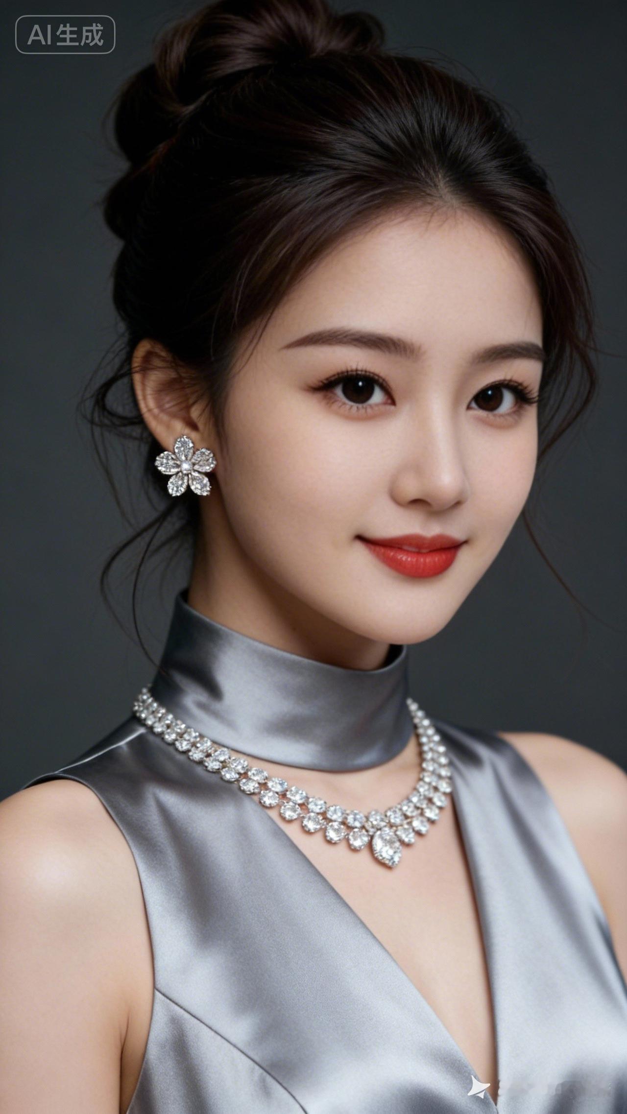 深棕低盘发髻缀几缕碎发,闪钻花朵耳钉配满钻短项链精致夺目,着简约利落黑西装,气质优雅干练,配饰闪耀,人物质感尽显。
