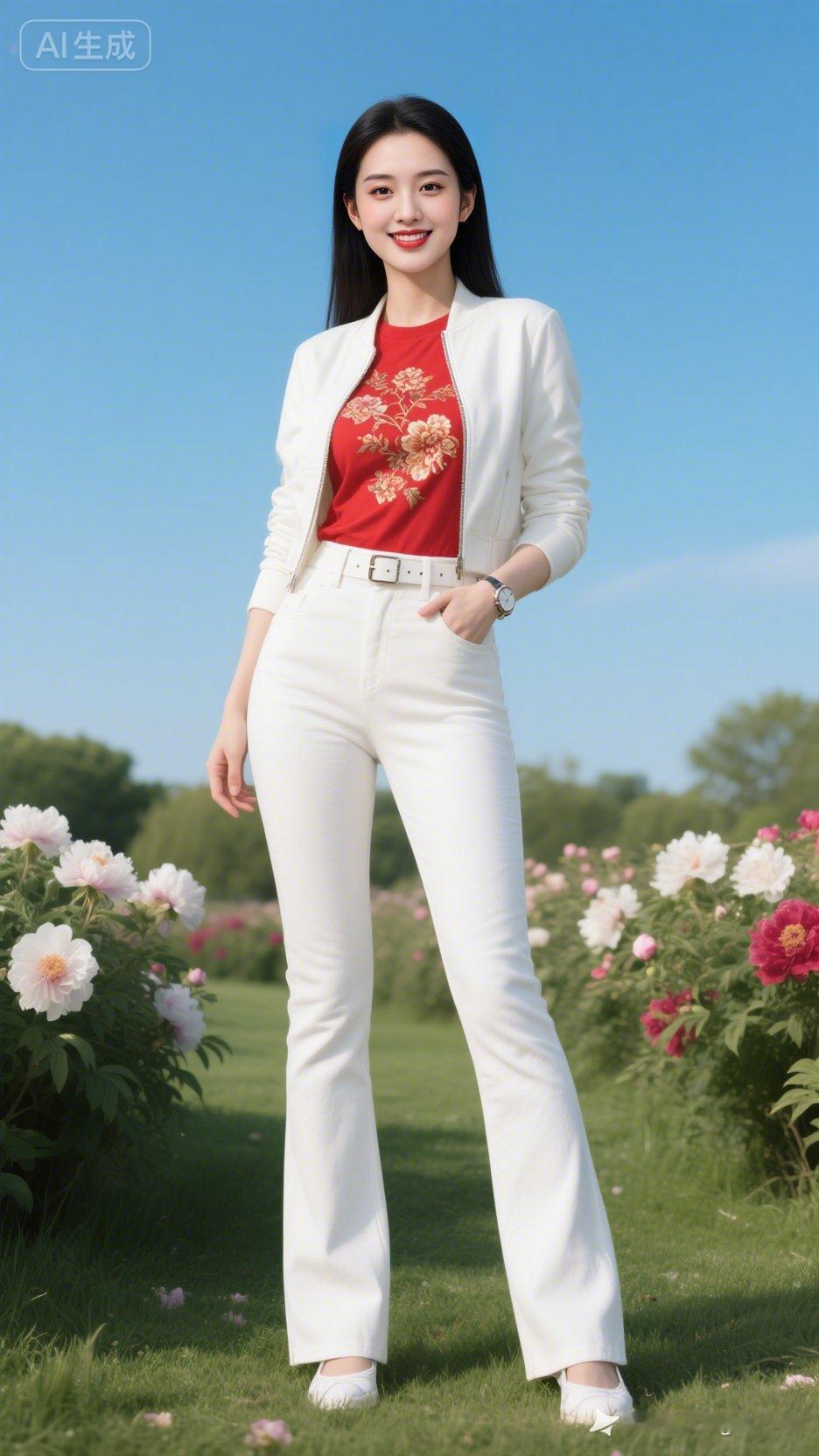 黑直发大美女立于牡丹草坪,蓝天作幕,着红纹T恤搭白夹克、白紧身微喇裤配腰带白布鞋,戴手表,正面摆拍,玉骨冰肌胜雪,秋水眼清澈明亮,微笑迷人,成熟高雅,黄金比例身材尽显绝美气质。