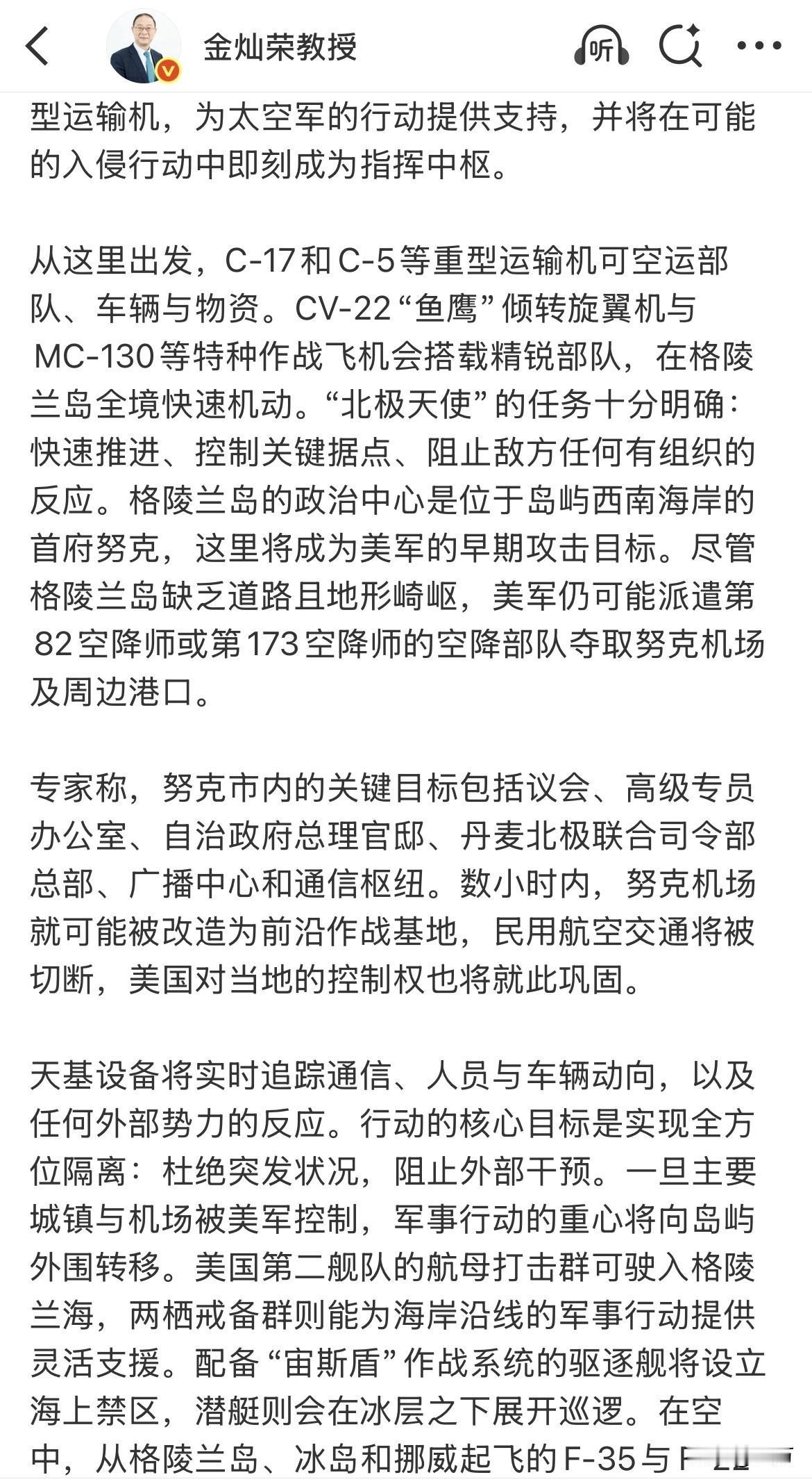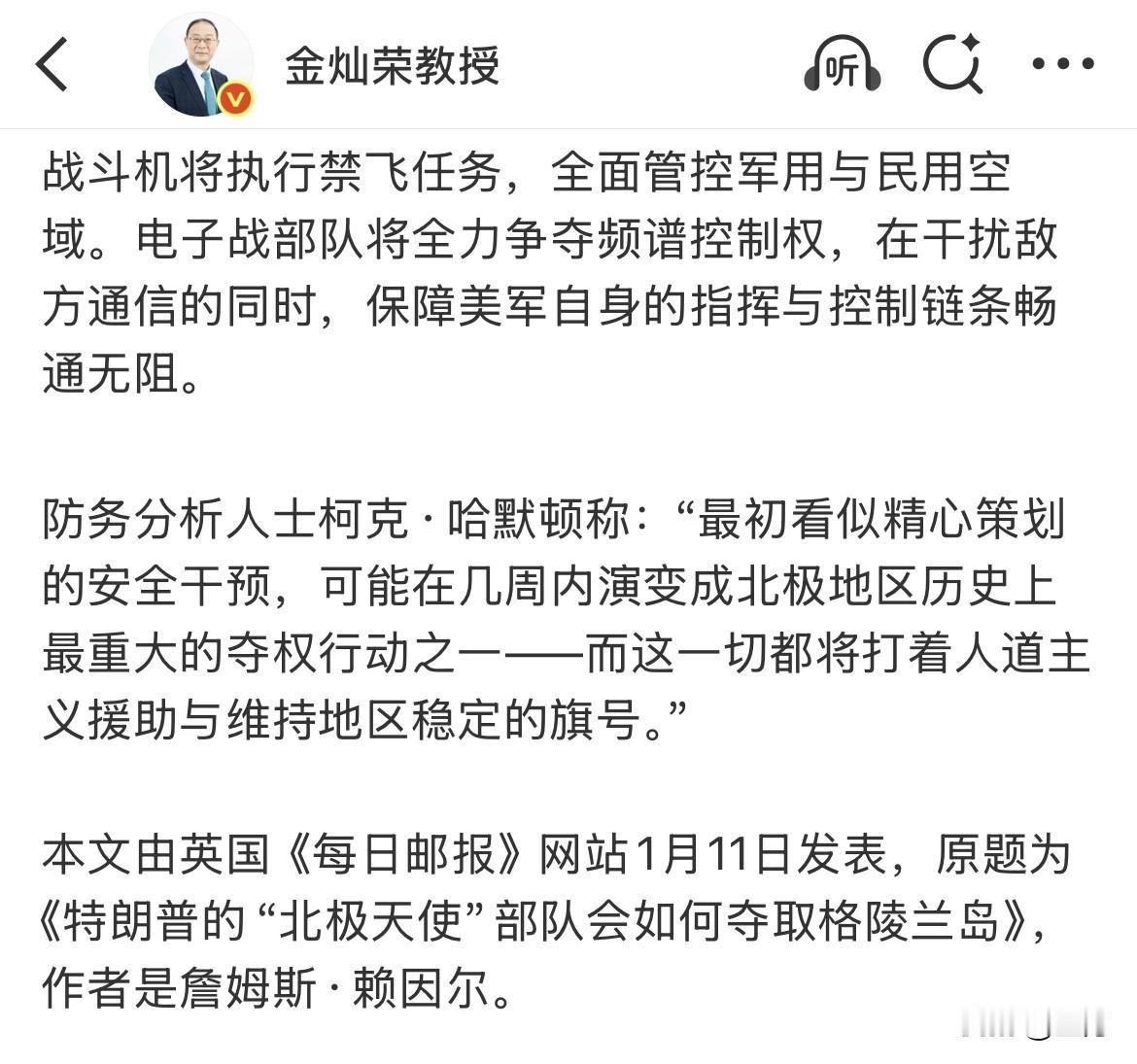 金灿荣教授凌晨6:00给我发文:格陵兰岛面积广阔,比墨西哥还要大,但人口稀少。岛