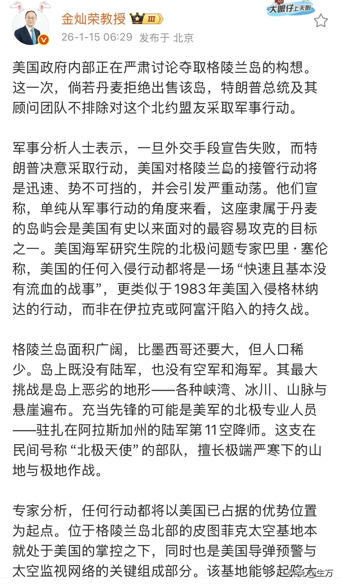 金灿荣教授凌晨6:00给我发文:格陵兰岛面积广阔,比墨西哥还要大,但人口稀少。岛上既没有陆军,也没有空军和海军! 以往金教授都睡得非常的晚 ,但是这段时间金教授起得非常的早,而且这几天他已经连续发文,其指军队格陵兰岛和伊朗两个地方 ,这两个地方存在的历史渊源和客观条件进行了全面的分析。 尤其是格陵兰岛,金教授认为,如果老头现在使用其他手段都没有什么效果的,可能他会用一些非常规的手段,不让自己陷入持久战的境地,快速地拿下他想要的地方。 尤其是这个格陵兰岛,认真地看了他的地理条件人口结构,尤其是军事组织的时候,如果老头真的要来硬的话,可以说是落花流水,让对方根本就没有阻挡的实力。 所以现在不管是格陵兰的还是伊朗,他们真的就是拿老头没有多少办法,一直在老头没有动手之前,他们会尽可能地做好准备的同时,再找一些伙伴,看看能不能够加入进来共同抵抗,这是他们目前能够选择的不多的路径之一。 但是这个时候,谁都不怎么敢通过任何形式增援或者加入,至少目前还没有看到,已经他们一眼就能看清楚老头的实力,所以大概率不会出现这么一个伙伴或者盟友,他们可能只会静静地看着这两个地方,被老头最终一点一点的蚕食。 至于会不会出现黑天鹅事件,会不会让老头的行动如此的流畅,会不会出现意想不到的抵抗,目前谁都不知道,这出戏很快就会上演,看看接下来是不是继续擒贼先擒王的游戏。