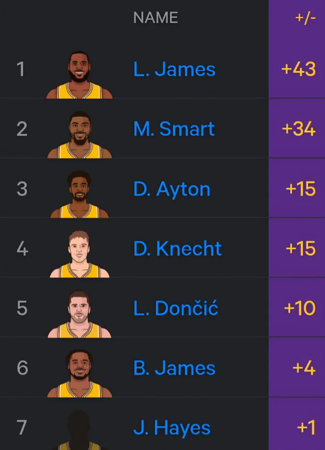 NBA常规赛,湖人战胜老鹰。赛后,湖人自媒体统计了进入26年以来湖人球员的正负值: 1、詹姆斯 +43 2、斯马特 +34 3、艾顿 +15 3、克内克特 +15 5、东契奇 +10 6、布朗尼 +4 7、海斯 +1