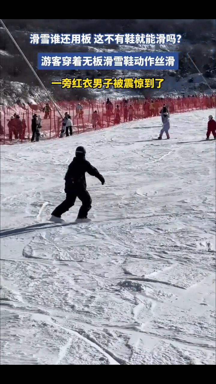 滑雪谁还用板,这不有鞋就能滑吗?游客穿着无板滑雪鞋动作丝滑,一旁红衣男子被震惊到了。 1月13日四川。评论留言。