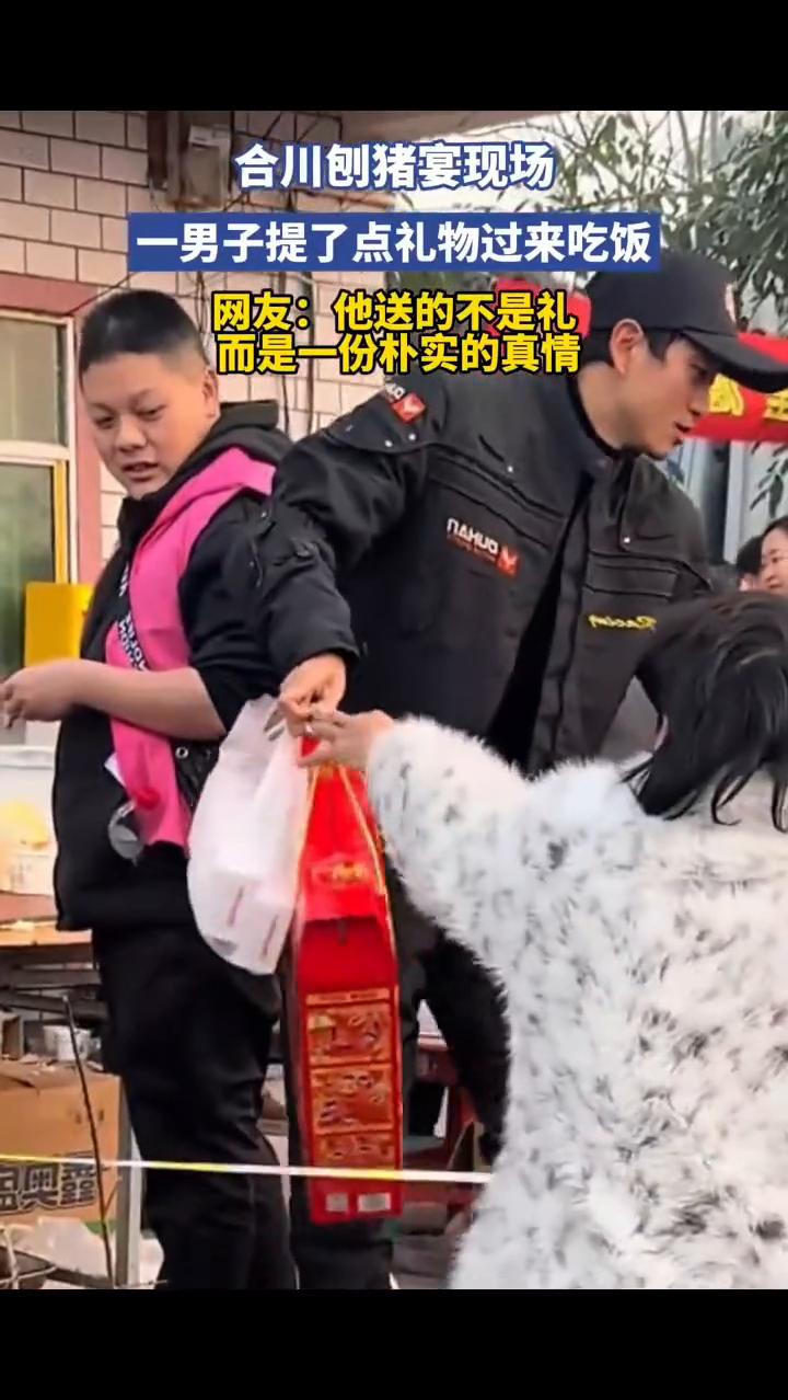 合川刨猪宴现场,一男子提了点礼物过来吃饭。网友:他送的不是礼,而是一份朴实的真情。 1月12日重庆。