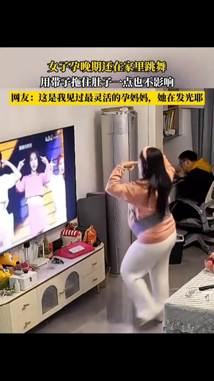 女子孕晚期还在家里跳舞,用带子拖住肚子一点也不影响。 网友:这是我见过最灵活的孕妈妈,她在发光。