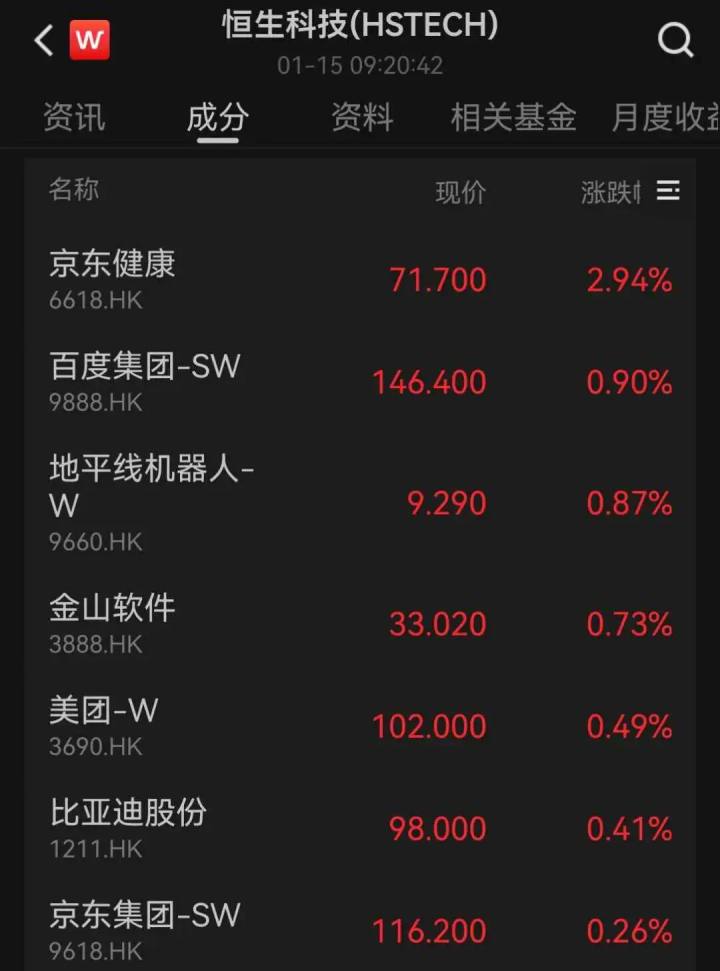 科网股表现分化,京东健康涨近3%,百度集团涨近1%;同程旅行、小鹏汽车跌逾2%。