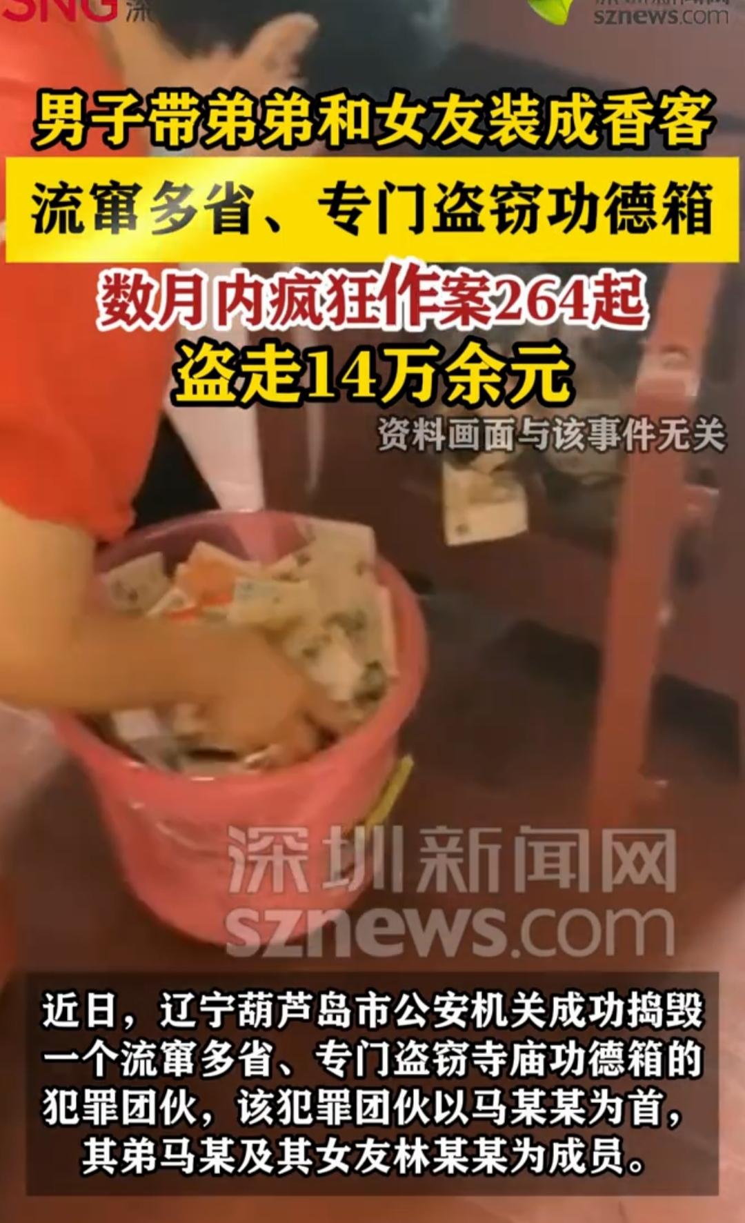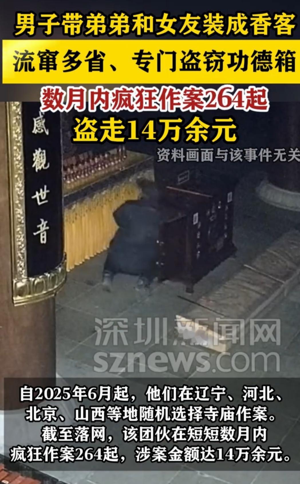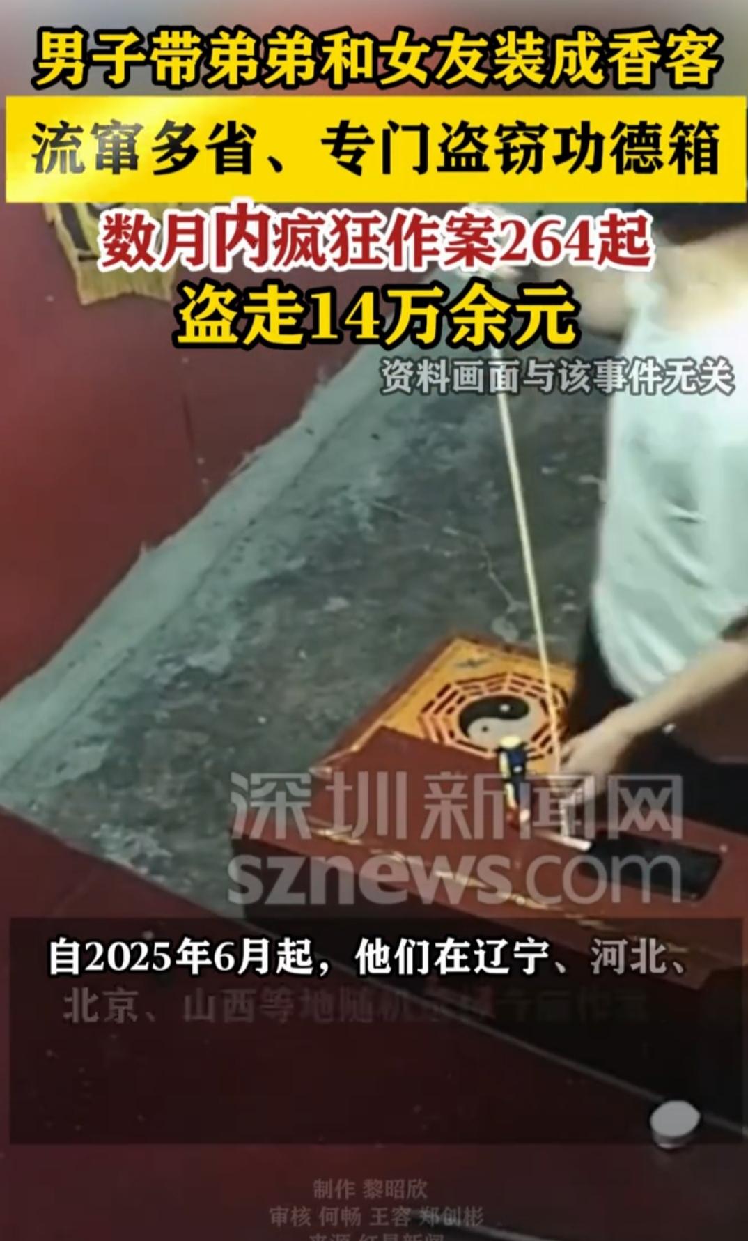 刷新三观!男子带弟弟女友流窜多省,264次偷功德箱盗走14万 谁能想到,寺庙里承载善念的功德箱,竟成了三人团伙的“提款机”!近日辽宁葫芦岛警方通报的一起案件,让无数网友怒批“缺德无底线”。 这起疯狂盗窃案的主犯马某某,竟拉上亲弟弟马某和女友林某某组成犯罪团伙,从2025年6月起开启跨省作案之旅。三人分工明确到令人发指:女友伪装成香客打掩护,弟弟负责遮挡监控、望风,马某某则用工具快速撬箱盗钱,通过手机导航随机寻找偏远寺庙下手,专挑安防薄弱的场所作案。 流窜辽宁、河北、北京、山西等多地,短短半年内他们疯狂作案264起,累计盗走香火钱14万余元。作案后还频繁更换车牌逃窜,给警方侦办带来不小难度。好在天网恢恢,2025年12月3日,专案组远赴山西大同,在宾馆内将三人一举抓获,当场查获涉案车辆、作案工具和部分赃款。 更让人愤慨的是,功德箱里的每一分钱都是香客的虔诚捐赠,多用于寺庙修缮和公益善举,并非无主之物,受法律严格保护。根据《刑法》规定,盗窃公私财物数额巨大的,最高可判十年以上有期徒刑。此前已有类似案例,有人因盗窃功德箱被判拘役并处罚金。 网友纷纷怒斥:“连善款都敢偷,良心是黑透了”“亲情爱情用错地方,迟早自食恶果”。这起案件也暴露了部分偏远寺庙的安防漏洞,提醒宗教场所需筑牢安全防线。目前三人已被刑事拘留,等待他们的将是法律的严惩。 善恶终有报,妄图靠窃取善款发家,注定是竹篮打水一场空。你怎么看待这起“组团偷功德箱”的案件?