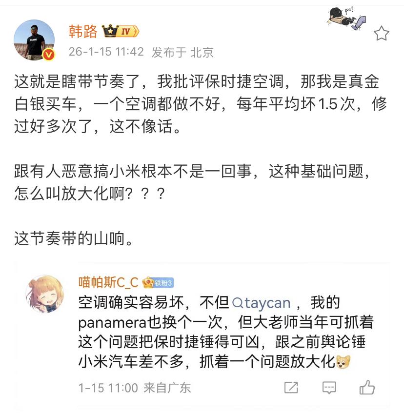 韩路:这就是瞎带节奏了,我批评保时捷空调,那我是真金白银买车,一个空调都做不好,每年平均坏1.5次,修过好多次了,这不像话。 跟有人恶意搞小米根本不是一回事,这种基础问题,怎么叫放大化啊??? 这节奏带的山响。