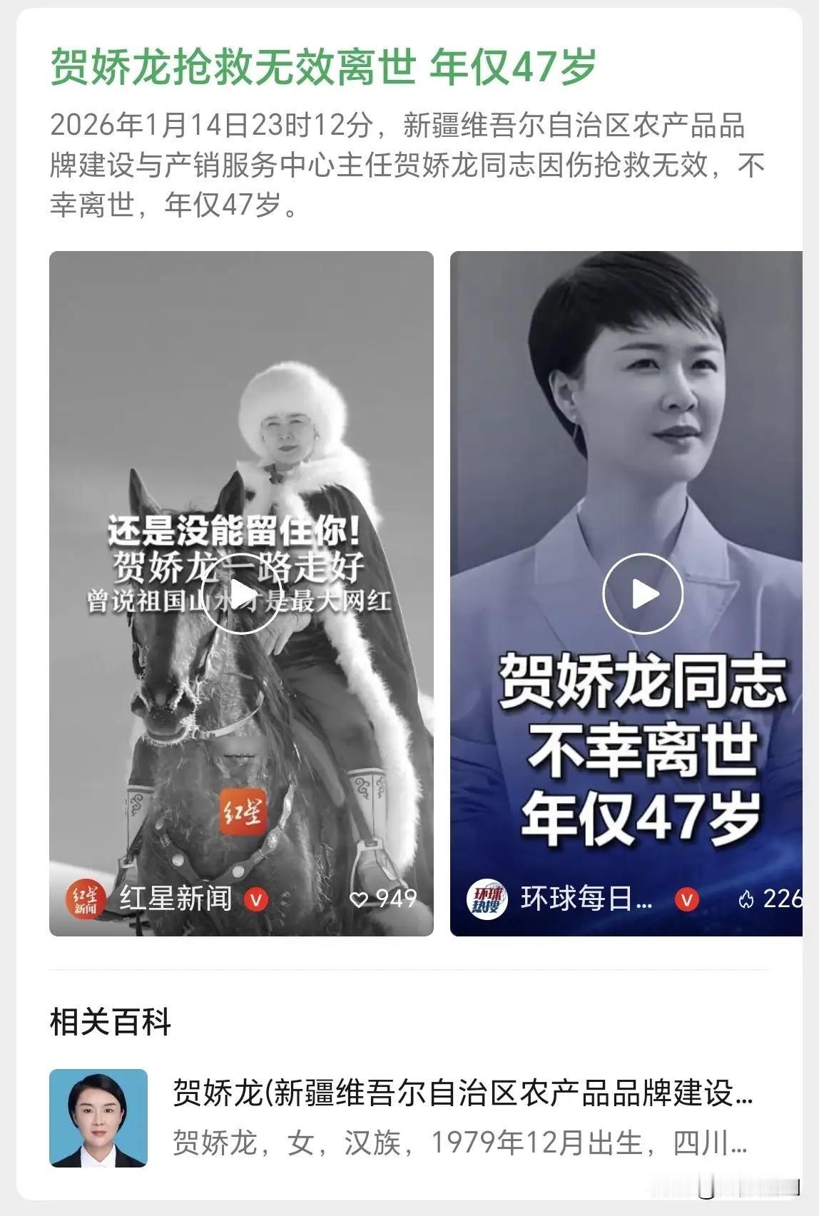疆二代扎根边疆做网红文旅官农特产品营销带头人,网红加官员。 策马走红,马背上倒下,这不是摆拍作秀是玩命,真玩完了! 现在的网红成了负面词,官员更没人喜欢,贺娇龙女流之辈为什么两个身份都能威武的存在,原来是玩命,把为人民服务做到极致! 董某辉为出名流量不择手段,直播间成了伪劣假冒产品的集散地,却仍有一群唯粉爱的死去活来,多一些贺娇龙少一些董某辉互联网才能变成健康的人民的互联网! 我们悼念网红县长文旅局长贺娇龙,社会有什么启示,哪些劣迹网红腐败官员脸红不?!