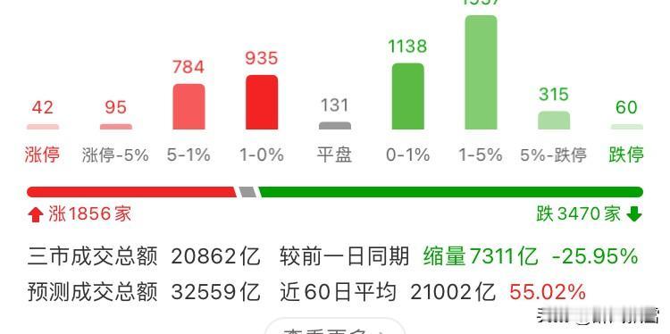 1月15日午盘 今天市场选择方向,情绪回落,大幅缩量,休息! A股市场普跌,涨1856家、跌3470家,跌停60家远超涨停42家,个股抛压显著。三市成交额20862亿,缩量7311亿,交投意愿低迷。资金面机构净流入80.54亿,主力、大户、散户合计净流出超900亿,大资金出逃致市场情绪恐慌。