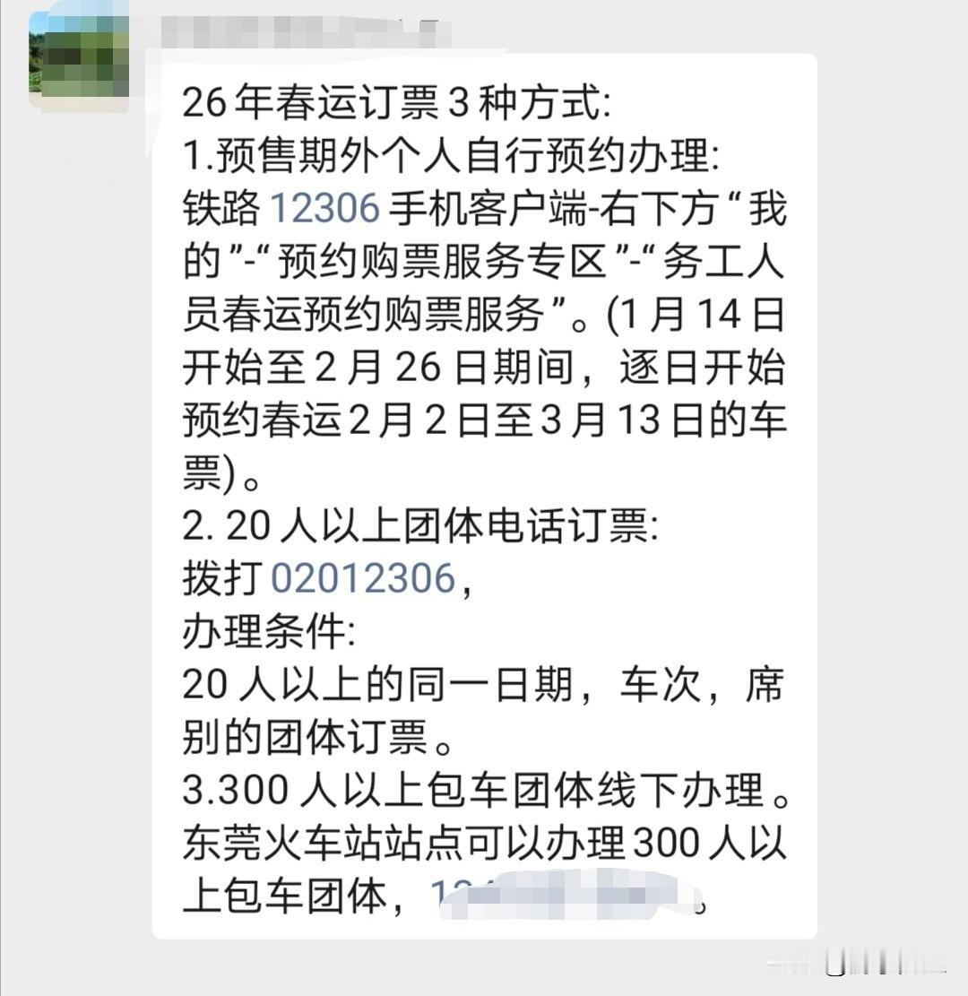 2026年春运外来工团体票订购方案已出炉。 2026年春运订购团体票有三种方式。 官方已更新的12306 app设有“预约购票服务专区”,可在此预约订购团体票。 个人线上办理预约,购票数量不能超过19张。 企业代办预约,购票数量为20 - 300张,可致电并按电话指引办理。 若要办理300张以上的东莞站团体票,需先到车站登记,且要求车票为同一日期、车次、方向方才可办理。