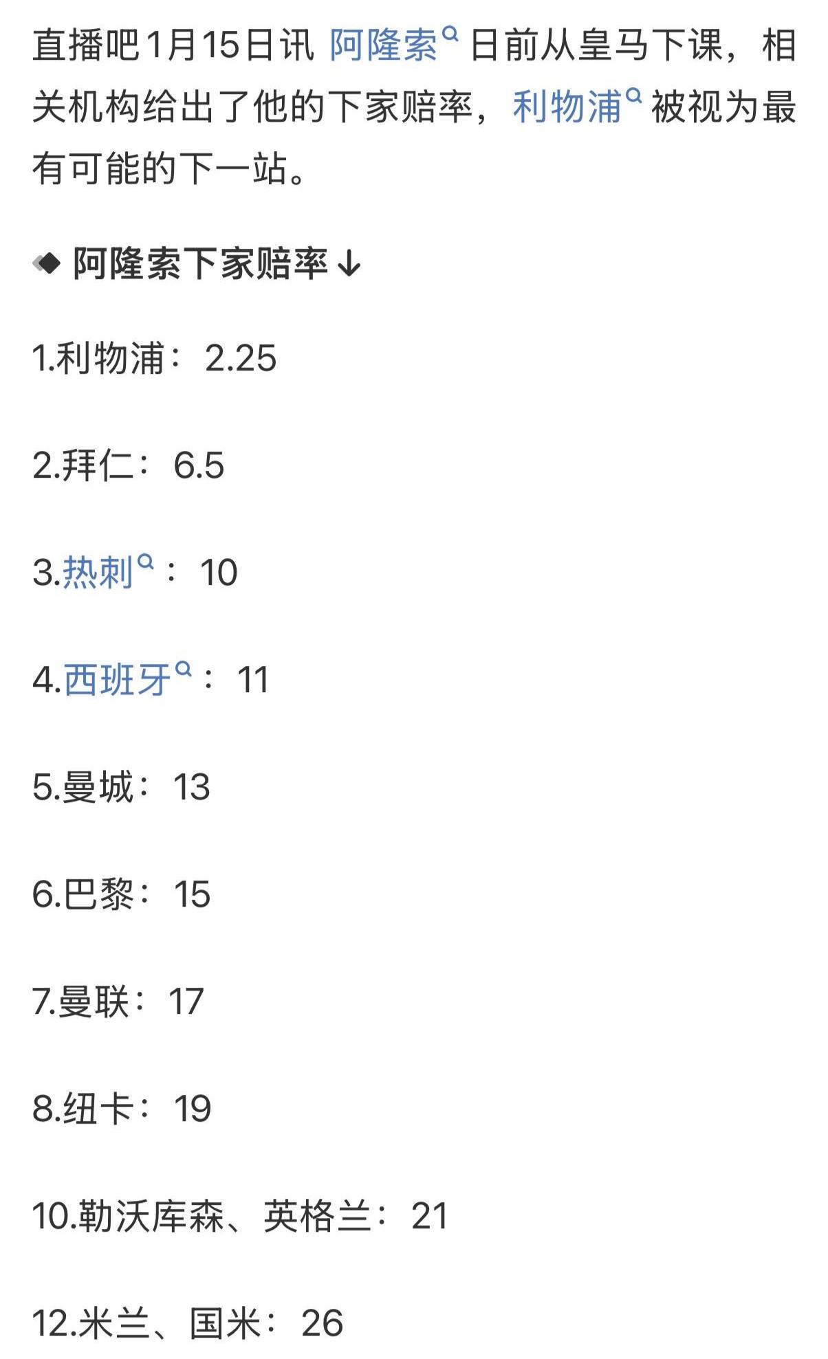 阿隆索的下家赔率出来,都是好工作呀。 利物浦最高,只要斯洛特再输几场,早就心心念念阿隆索的红军会换帅。 拜仁看欧冠成绩,如果不好的话,孔帕尼会下课,拜仁很喜欢战胜过他们的教练,克洛普,阿隆索都属于。 热刺敢去吗??说不定成功呢。 瓜迪奥拉要离开曼城,恩里克也拒绝大巴黎续约,阿隆索都有机会呢。[大金牙]