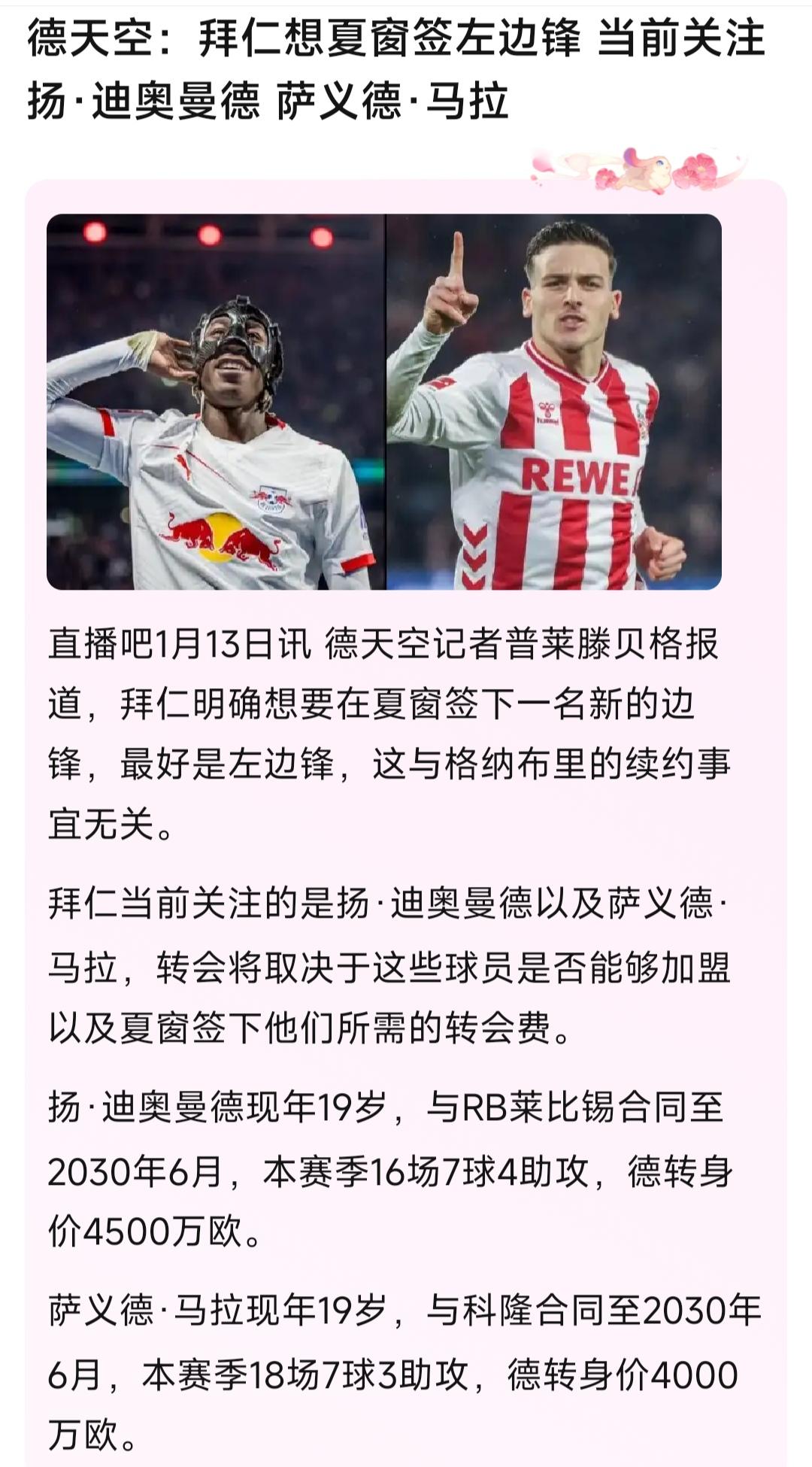 拜仁好像要继续在德甲吸血? 莱比锡19岁天才边锋迪奥曼德,科隆19岁天才边锋马拉,都是拜仁的最新目标。 说实话这些年德甲天才很多,拜仁近水楼台先得月,多挖掘几个能在欧冠保持竞争力。 德甲球队也没办法,抗衡不了。[皱眉]