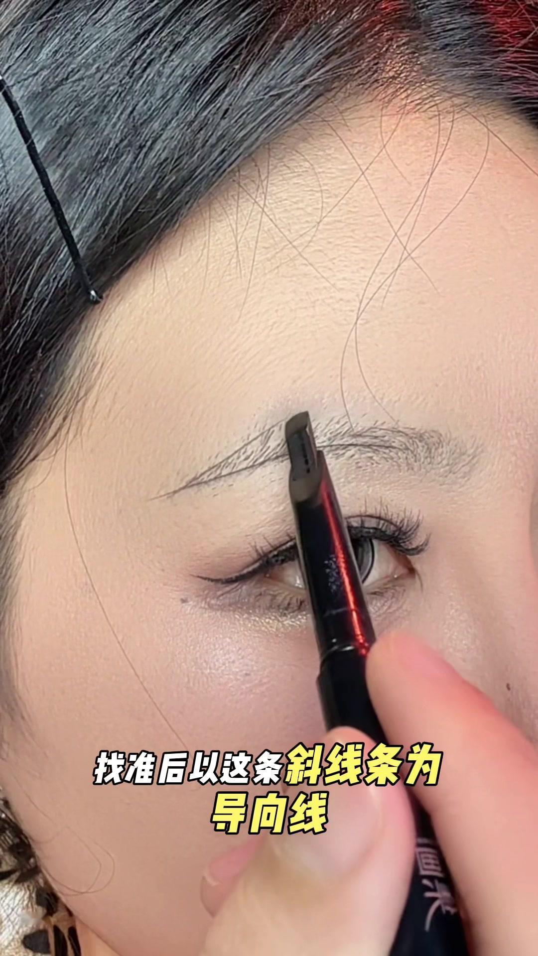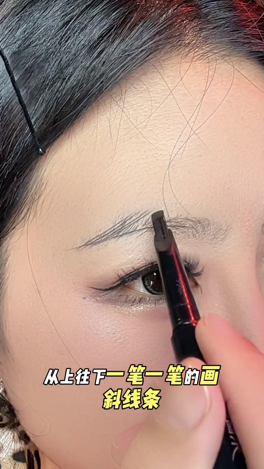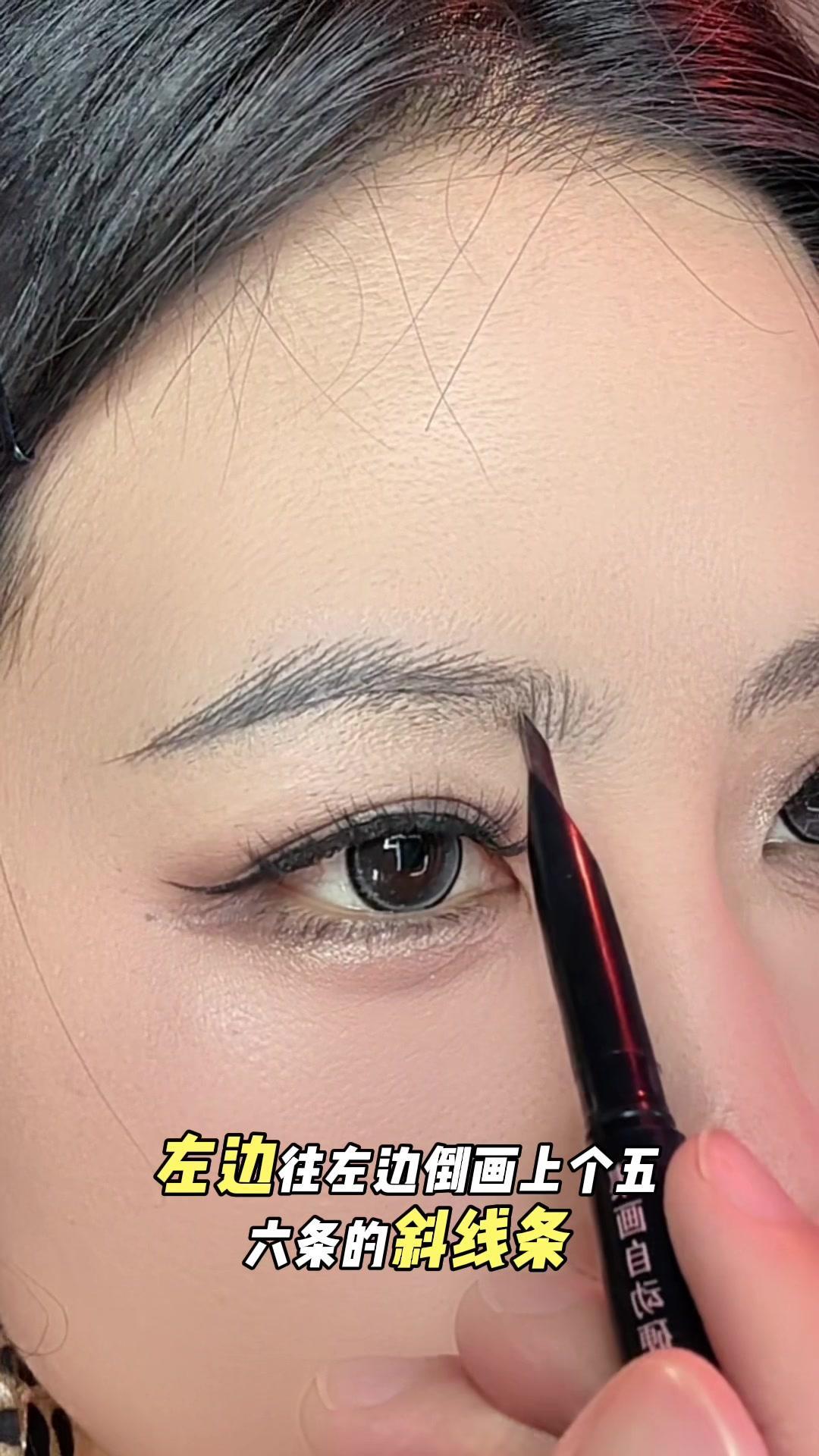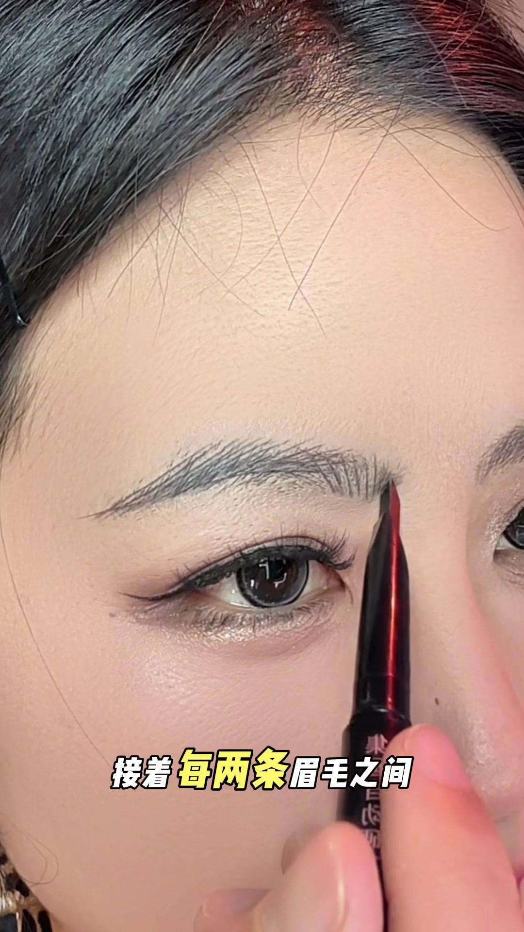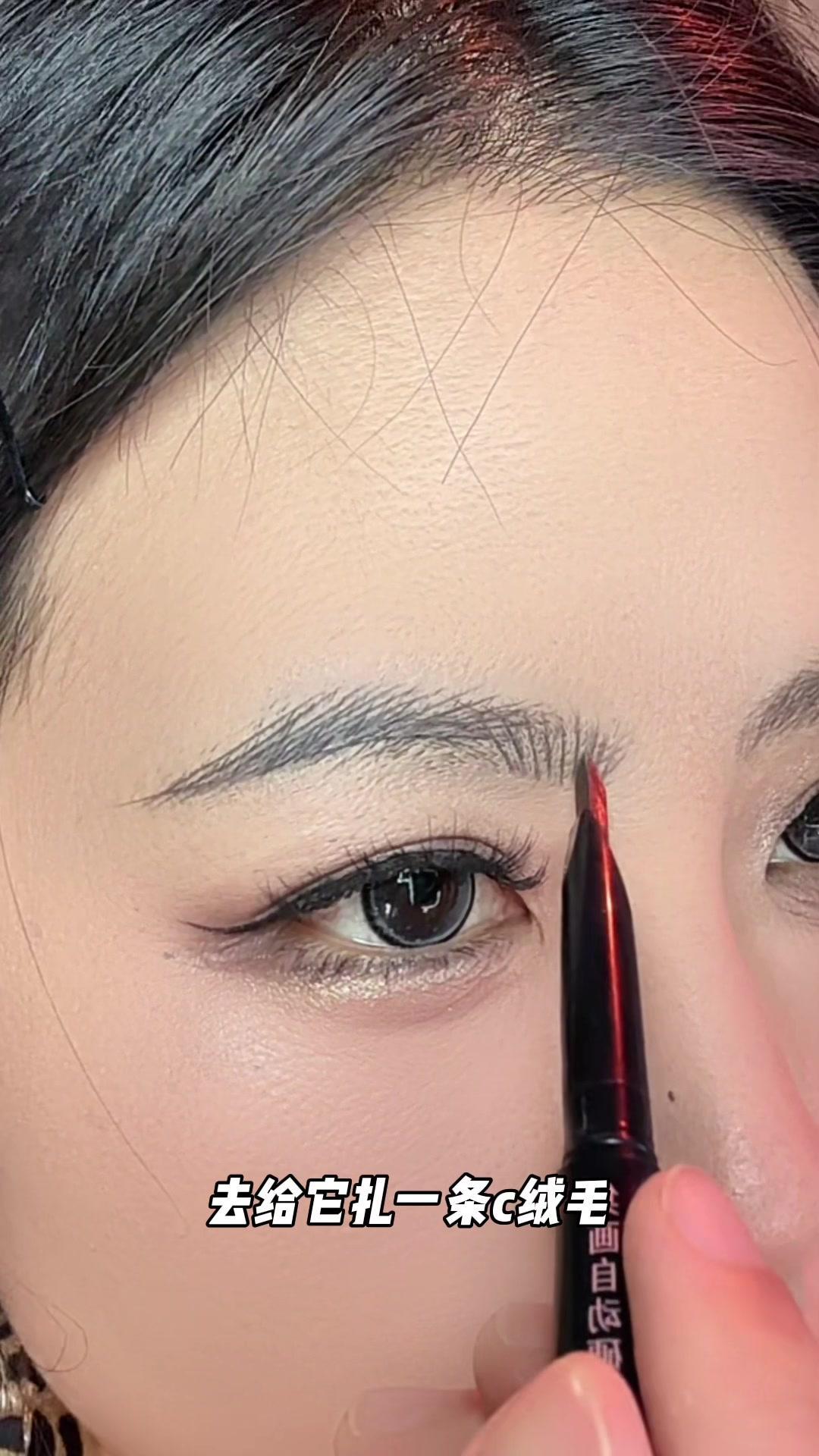 先找到瞳孔正上方,这里是眉毛中心线,从这里往眉尾画一条弧线,三点定眉尾。眼白中心处往上找眉峰,用眉笔芯宽度作高度参考,找准后以这条斜线条为导向线,从上往下一笔一笔画,直到和眉头相交处,倒下去加一点点雾面过渡。 第二步,从内眼角直直往上推找眉头位置,左边画五六条斜线条,一条比一条短;右边画两三条。然后在每两条眉毛之间加细绒毛,顺着最后一条斜线条往上推,一直到眉尾,这样眉毛的毛流感就出来了~ 最后把眉毛中间颜色加深一点,更显浓密流畅,整个效果又自然又野生,完全不会假!