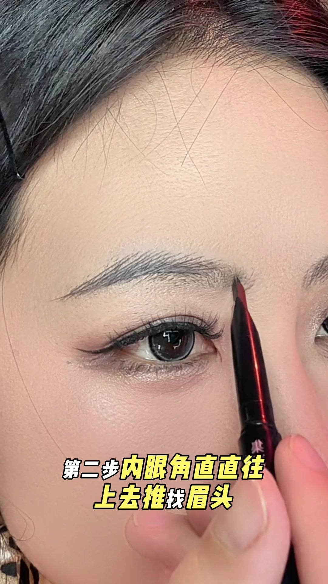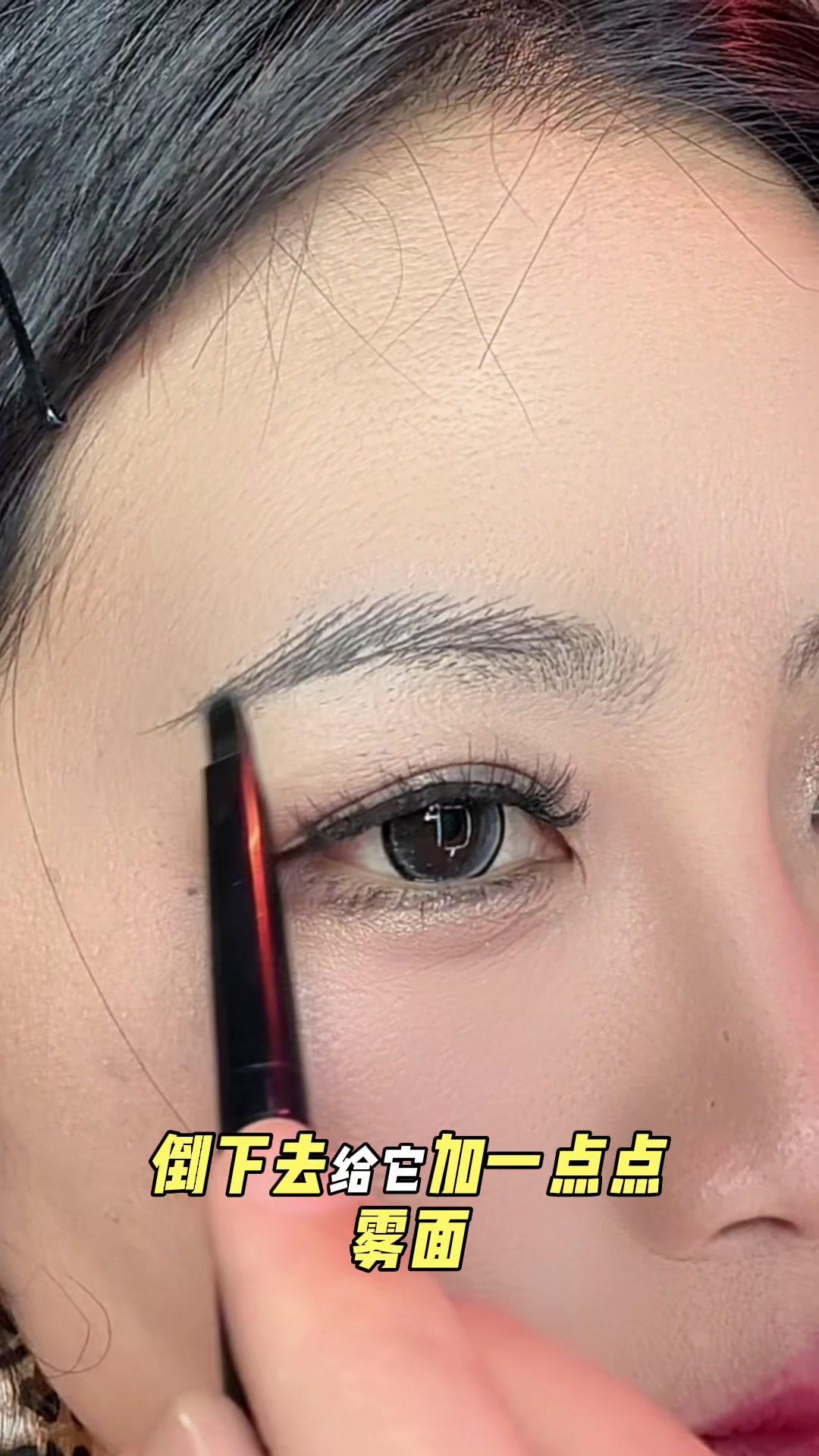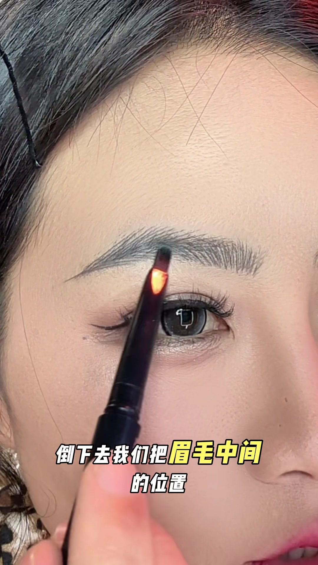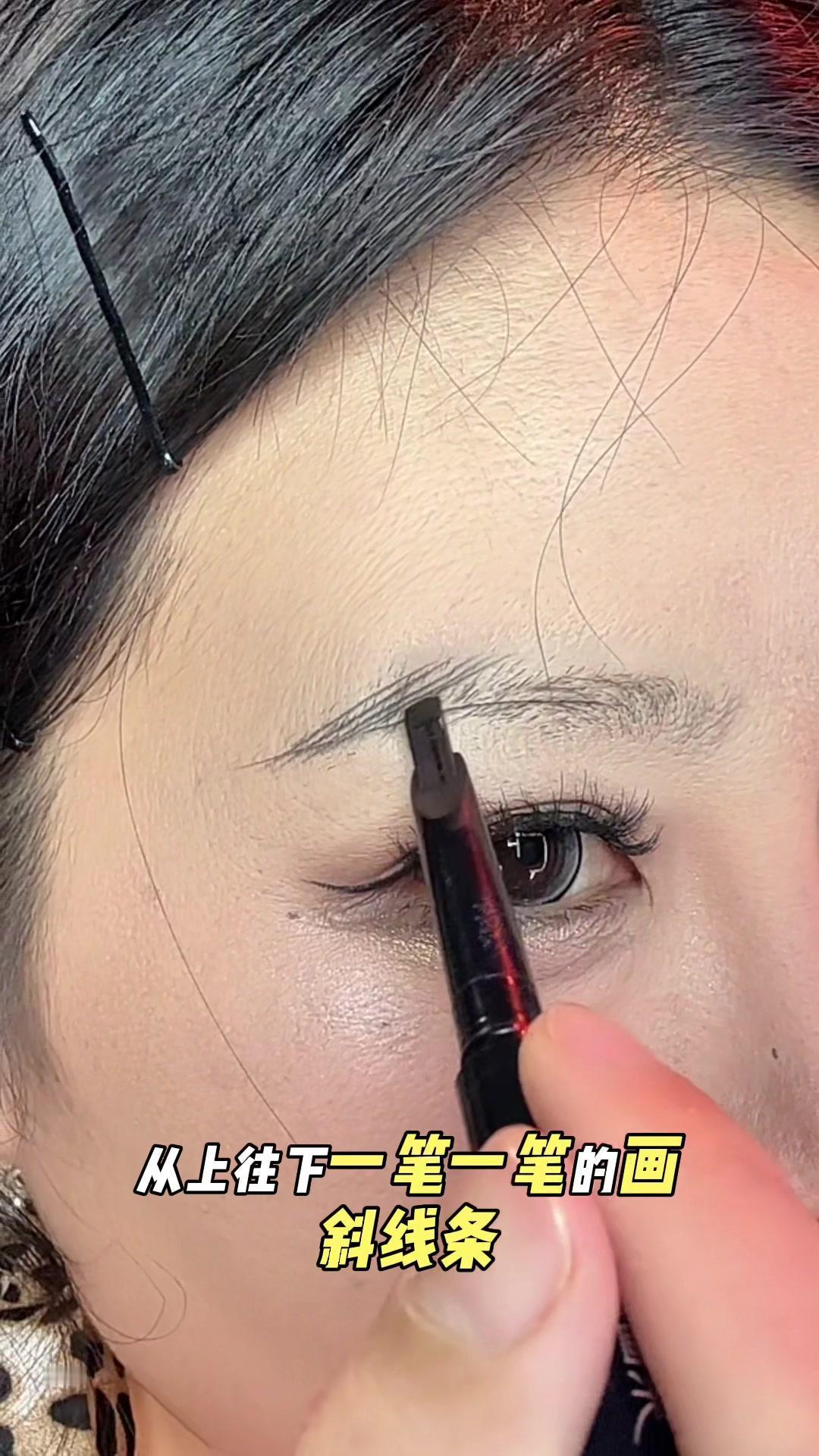 先找到瞳孔正上方,这里是眉毛中心线,从这里往眉尾画一条弧线,三点定眉尾。眼白中心处往上找眉峰,用眉笔芯宽度作高度参考,找准后以这条斜线条为导向线,从上往下一笔一笔画,直到和眉头相交处,倒下去加一点点雾面过渡。 第二步,从内眼角直直往上推找眉头位置,左边画五六条斜线条,一条比一条短;右边画两三条。然后在每两条眉毛之间加细绒毛,顺着最后一条斜线条往上推,一直到眉尾,这样眉毛的毛流感就出来了~ 最后把眉毛中间颜色加深一点,更显浓密流畅,整个效果又自然又野生,完全不会假!