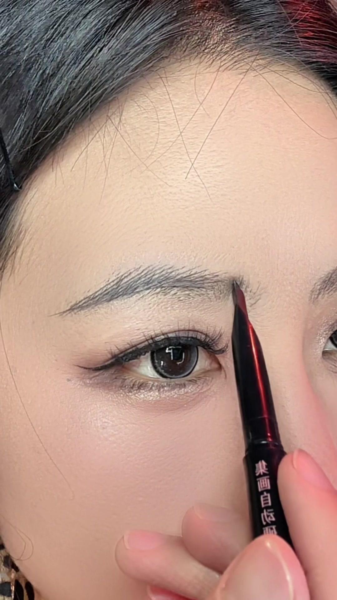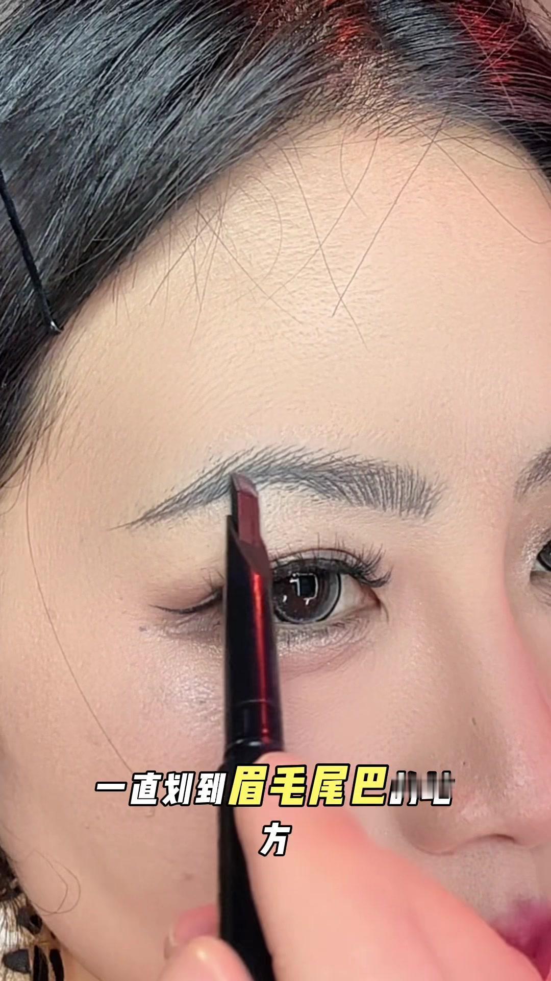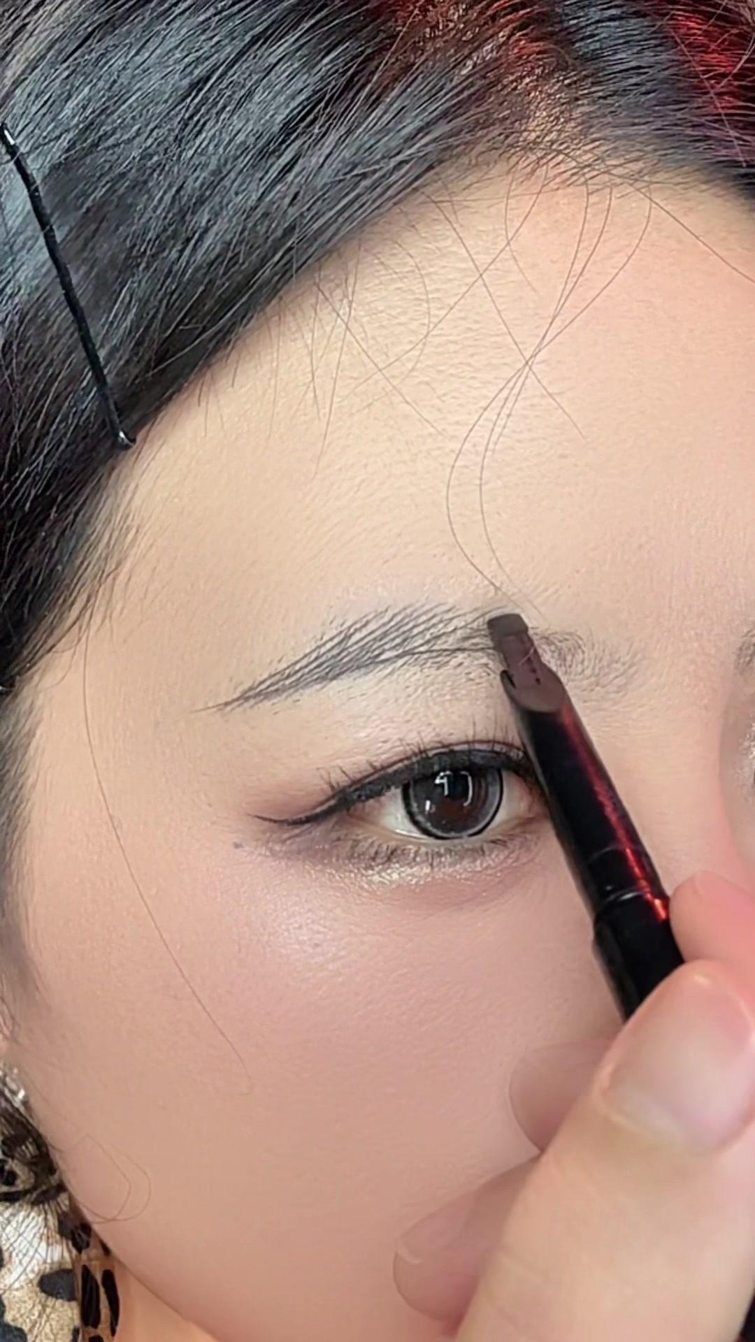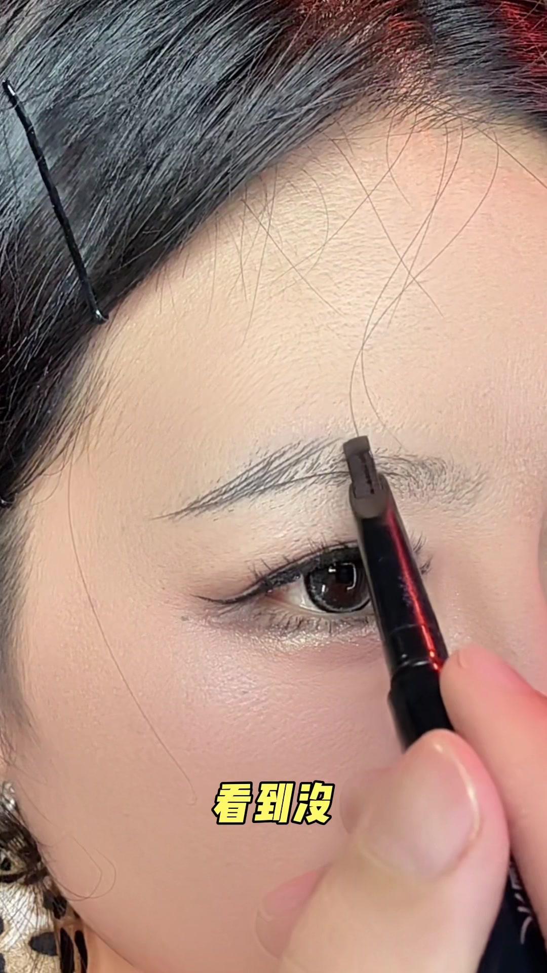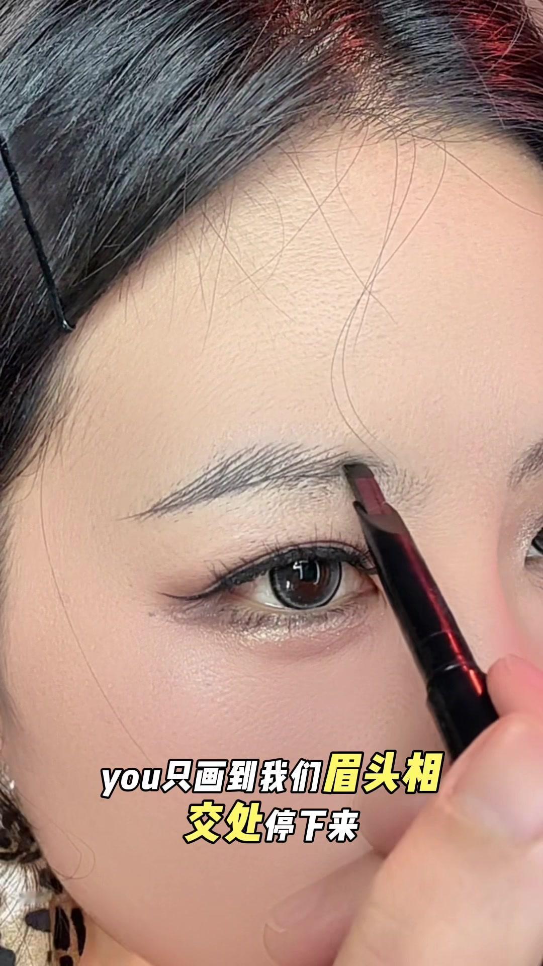 先找到瞳孔正上方,这里是眉毛中心线,从这里往眉尾画一条弧线,三点定眉尾。眼白中心处往上找眉峰,用眉笔芯宽度作高度参考,找准后以这条斜线条为导向线,从上往下一笔一笔画,直到和眉头相交处,倒下去加一点点雾面过渡。 第二步,从内眼角直直往上推找眉头位置,左边画五六条斜线条,一条比一条短;右边画两三条。然后在每两条眉毛之间加细绒毛,顺着最后一条斜线条往上推,一直到眉尾,这样眉毛的毛流感就出来了~ 最后把眉毛中间颜色加深一点,更显浓密流畅,整个效果又自然又野生,完全不会假!