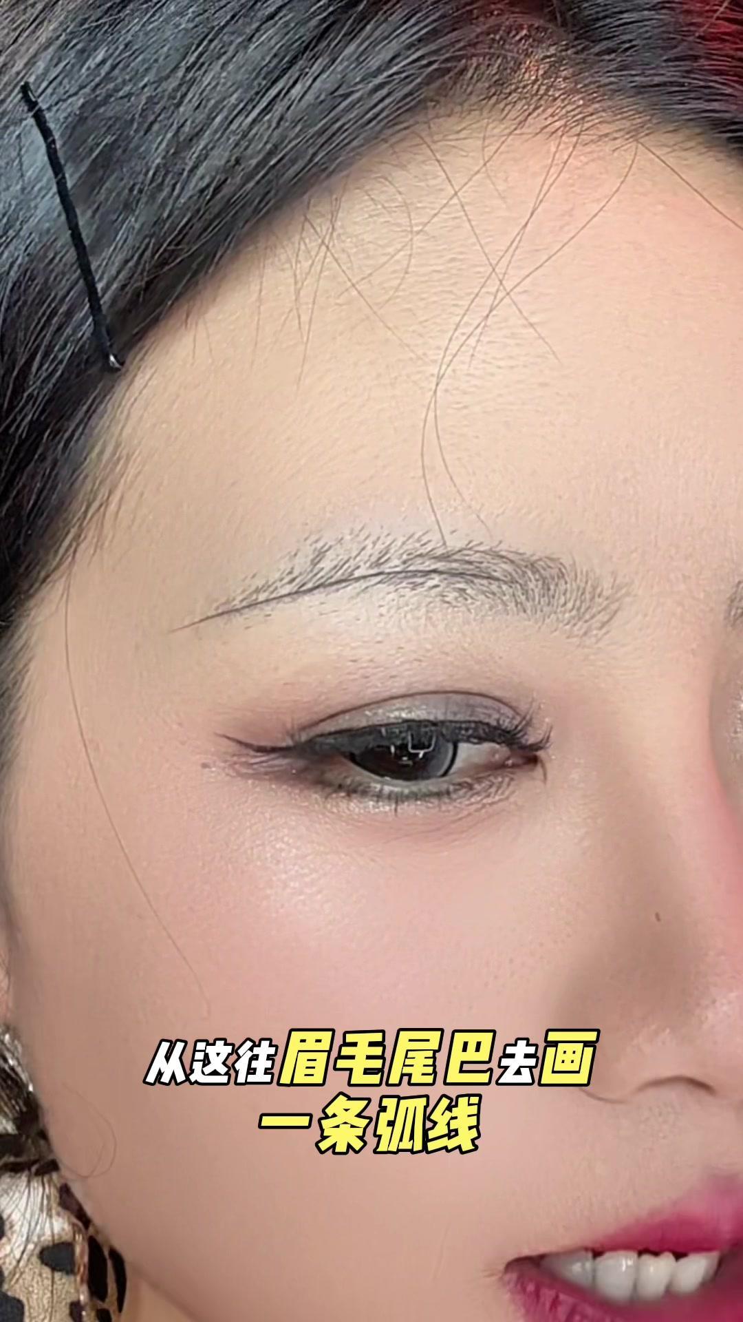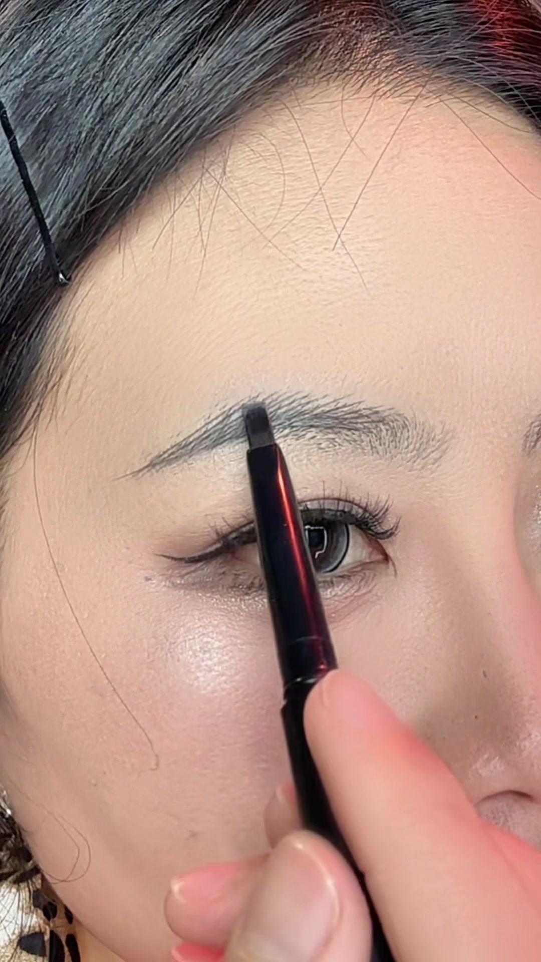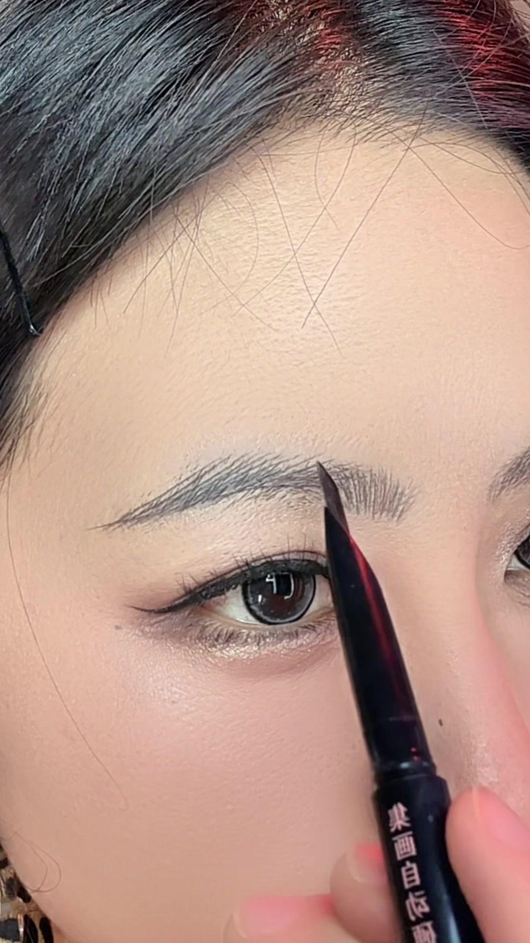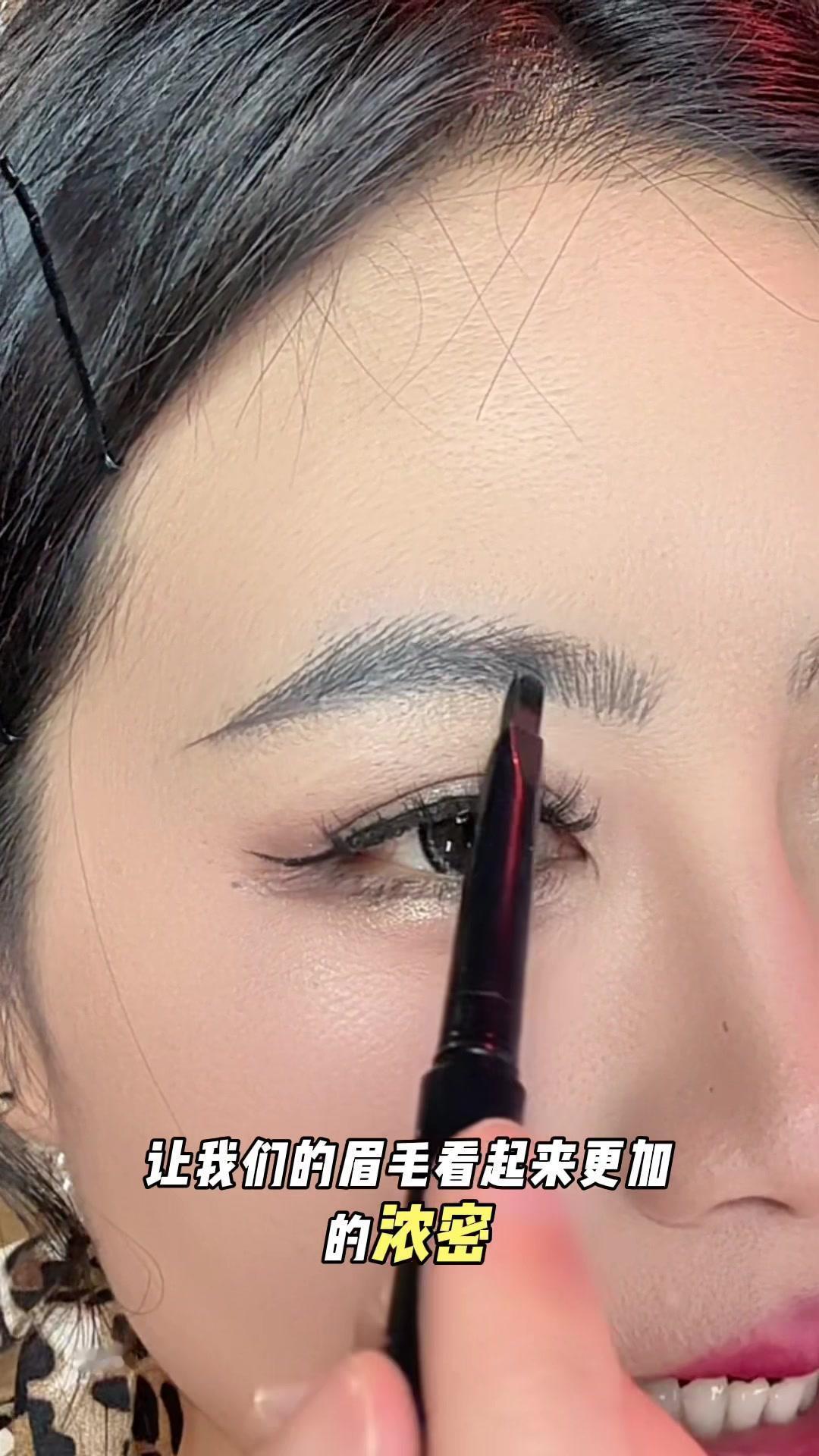 先找到瞳孔正上方,这里是眉毛中心线,从这里往眉尾画一条弧线,三点定眉尾。眼白中心处往上找眉峰,用眉笔芯宽度作高度参考,找准后以这条斜线条为导向线,从上往下一笔一笔画,直到和眉头相交处,倒下去加一点点雾面过渡。 第二步,从内眼角直直往上推找眉头位置,左边画五六条斜线条,一条比一条短;右边画两三条。然后在每两条眉毛之间加细绒毛,顺着最后一条斜线条往上推,一直到眉尾,这样眉毛的毛流感就出来了~ 最后把眉毛中间颜色加深一点,更显浓密流畅,整个效果又自然又野生,完全不会假!